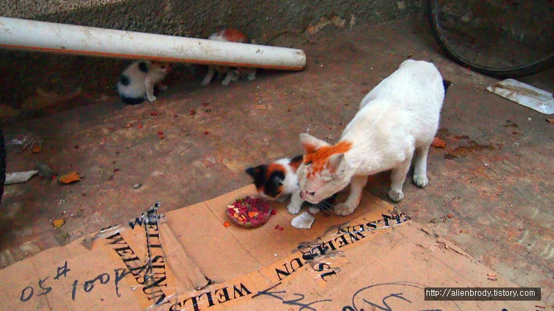 갑자기 녀석들이 격하게 울어댄다. 뒤를 돌아보니 어미 냥이가 돌아와 있었다. 미안, 별일 없었다오. 네가 엄마였구나. 평소에 많이 거두어 먹이던 녀석이다. 매일 지나가기만 해도 몸을 비벼오던 녀석인데, 오늘은 아기 냥이들 때문인지 경계를 늦추지 않는다. 그래서 준비했다네.