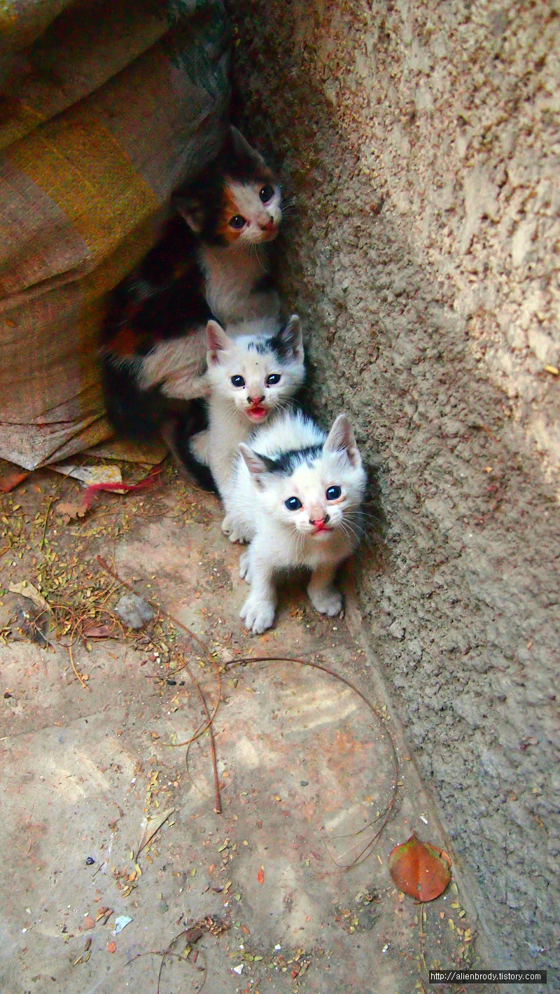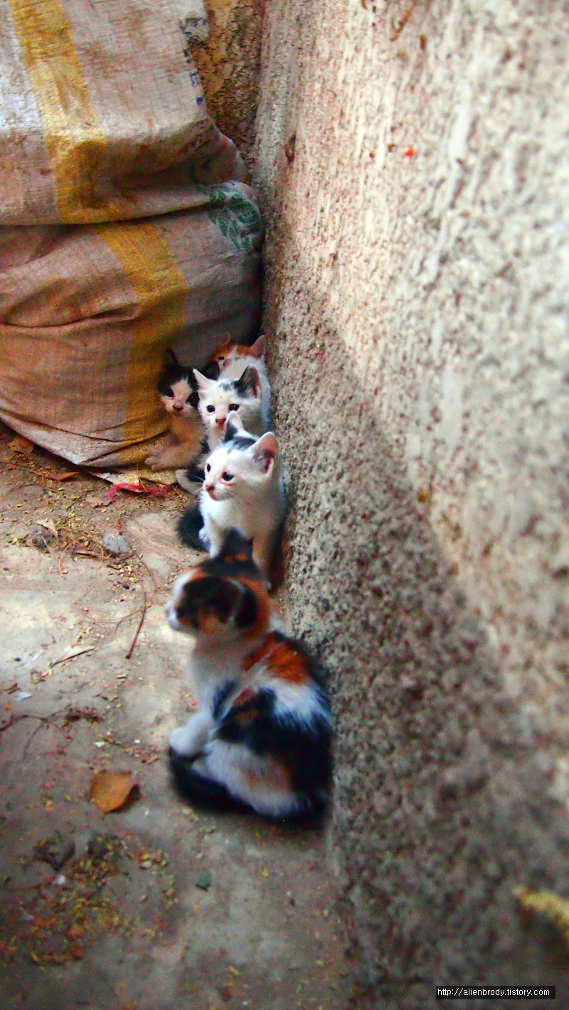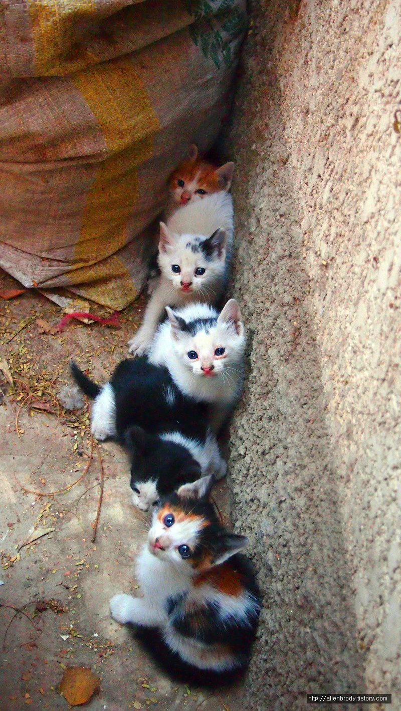 바로 건너편 집 담 아래에는 아기 냥이들이 태어나 있었다. 낑낑거리는 소리에 들여다보니 창틀 아래 옹기종기 알로기 달록 이들이 모여있었다. 모두 다섯 마리. 앗, 실수했다. 아무 생각 없이 너무 가까이 다가갔다. 혼비백산하여 구석으로 달아났다.
