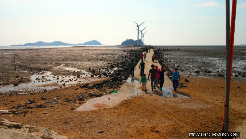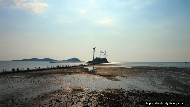 저 멀리 풍력발전기들 너머로 보이는 섬이 누에섬이다. 썰물 때에는 이렇게 누에섬으로 향하는 길이 열린다. 이때는 이미 오후 2시가 넘은 시각. 누에섬을 들렀다 나오는 이들로 길이 서서히 붐비기 시작하였다.