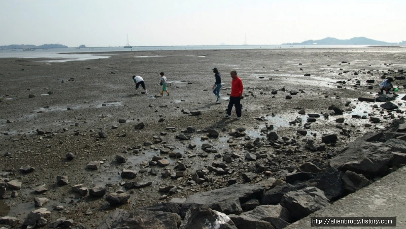 이미 시간이 늦었다. 빨리빨리 움직여야 겨우 누에섬을 들렀다 돌아나올 시간이 되리라. 바삐 발걸음을 옮기기 시작하였다. 헌데 나를 붙드는 풍경들이 많다. 이미 지척까지 물이 들어왔으나 조개 줍기에 여념이 없는 아이들. 멀찍이서 안전요원 어르신들이 아이들을 재촉한다. 아이들은 계속 자릴 지키며 조개를 줍고, 어르신들은 왔다 갔다 사람몰이를 하시고. 이곳에서는 익숙한 풍경인가 보다.