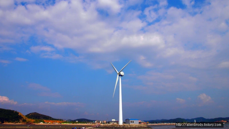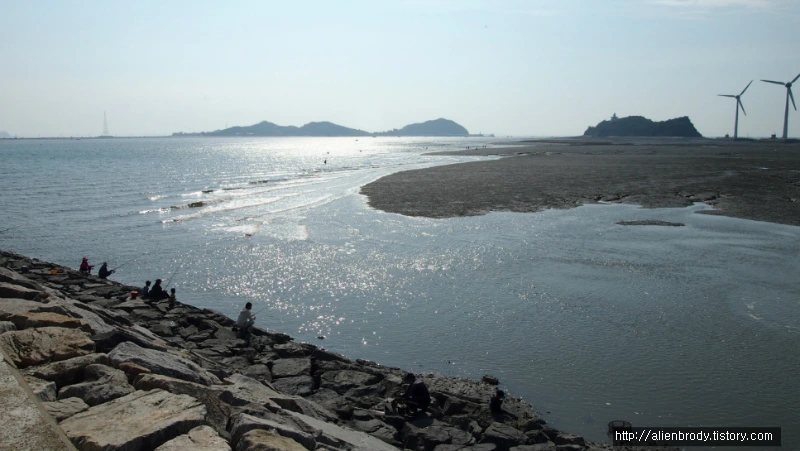 누에섬 방향으로 한참을 걷다가 뒤를 돌아보면 이렇게 훌륭한 풍경이 펼쳐진다. 풍력발전을 위한 커다란 바람개비 덕분에 이 곳 탄도항은 사진을 찍는 이들이 즐겨 찾는다고 한다. 거대한 바람개비가 열을 지어 서있는 모습은 분명 다른 곳에서는 쉽게 찾을 수 없는 풍경 이리리라.