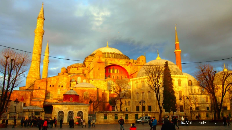 내부에 고스란히 남아있는 억 겹의 역사를 접하기도 전에 아름다운 외관에 정신이 팔려버렸다. 한 걸음, 두 걸음, 걸음을 뒤로 한다. 하나의 앵글에 하기야 소피아를 오롯이 담기가 쉽지 않다. 곰을 닮은 어느 총각의 모호한 뒷걸음질은 이내 그를 깊은 감동으로 이끌었다. 처음 구도를 잡았던 곳에서 열 걸음도 넘게 뒷걸음질을 치고서야 겨우 그럴싸하게 이스탄불의 상징을 오롯이 담아내었다. 4세기에 지어져 그간 겪어온 숱한 아픔은 온 데 간데없다. 걸음을 더 할수록, 각도를 달리 할수록 하기야 소피아의 자태가 면면히 드러났다. 마침 하늘이 열려 하기야 소피아 위로 햇살이 쏟아진다. 뒷걸음질을 치다 우연히 신구 세계의 접점을 꽤 그럴싸하게 담아냈다. 혼자만의 생각이겠지만.
