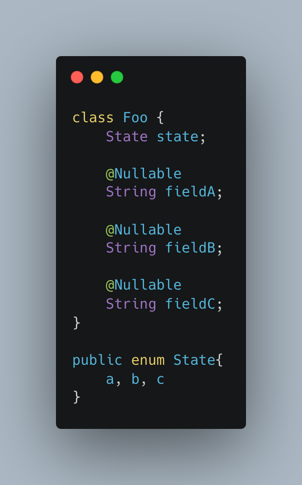 Foo가 가지는 state의 값이 notNull인 필드를 결정하는 케이스를 생각해보자. state가 a면 fieldA가 notNull이고, b면 fieldB가 notNull이다. 테스트 케이스마다 state 값이 달라지는 경우 테스트하기 어렵다. 테스트 케이스마다 필요한 값이 다르다. 따라서 테스트 케이스마다 객체를 다르게 생성할 수 있어야 한다.