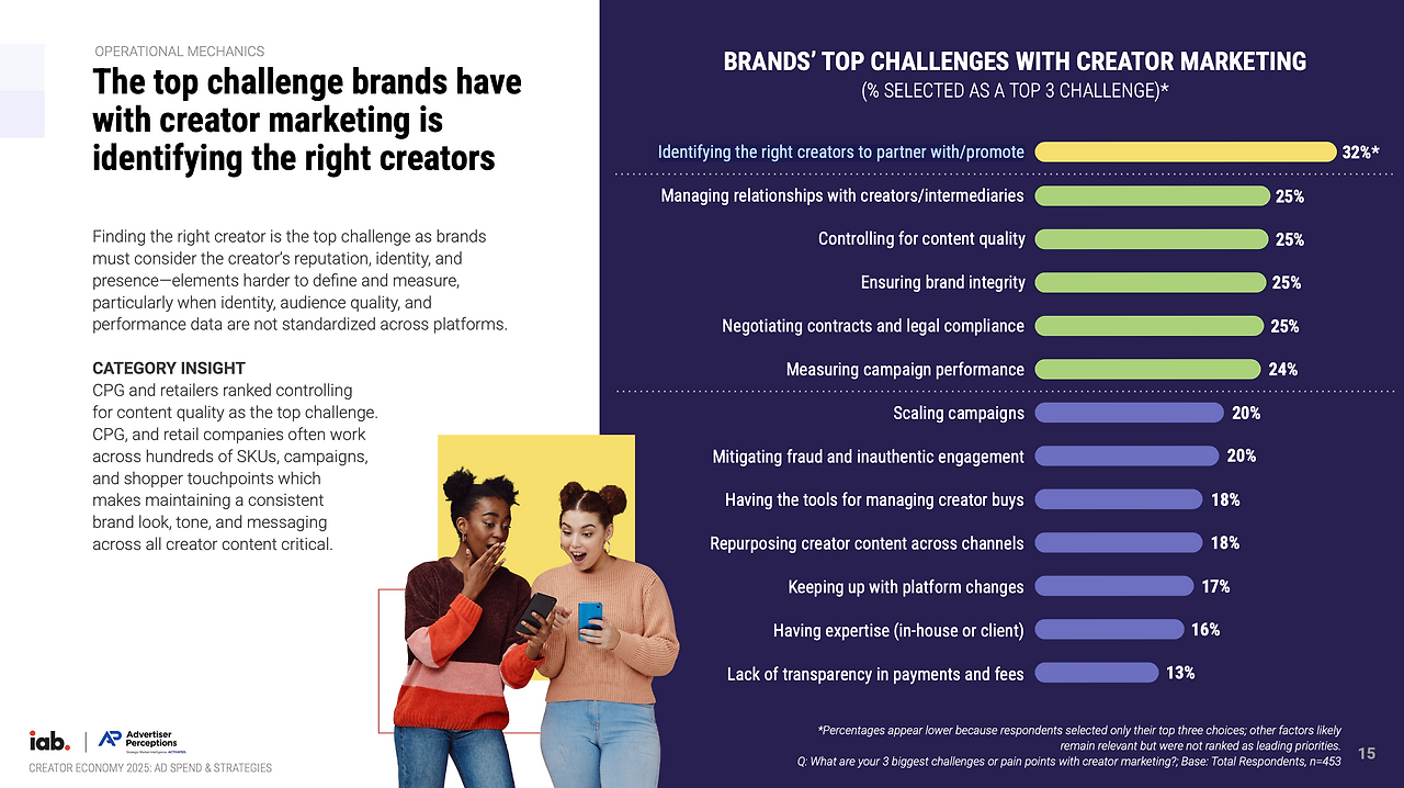 IAB(미국 인터넷광고협회)가 발표한 「Creator Economy 2025: Ad Spend & Strategies」리포트에 따르면, 브랜드가 인플루언서 마케팅에서 크리에이터를 직접 선정할 때 중요하게 고려하는 기준은 다음과 같습니다.