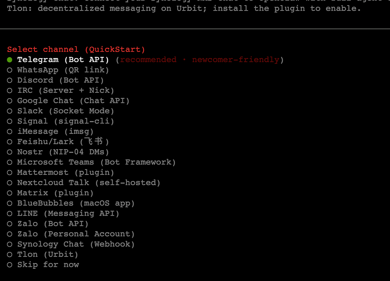 그다음에 어떤 메신저를 통해 오픈클로 에이전트와 소통할지 선택하는 화면이 나온다.