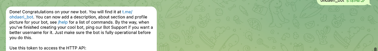 /newbot을 치면 봇의 이름을 정하라고 한다. 대충 적당한 걸 적는다. 봇의 이름은 채팅창에 표시될 봇의 이름이다.