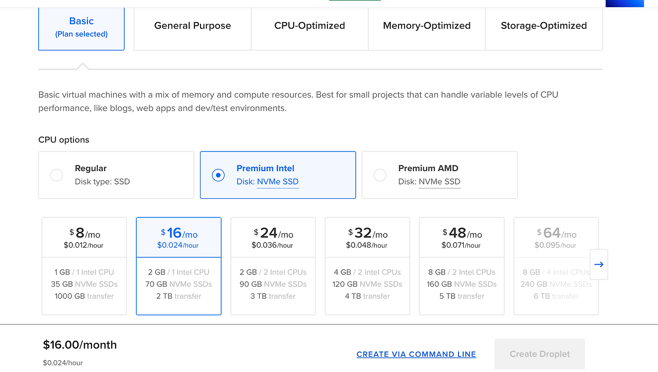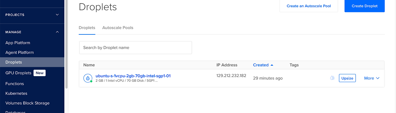 회원가입 후 Droplets라는 서비스를 클릭 후 Create Droplet을 클릭한다