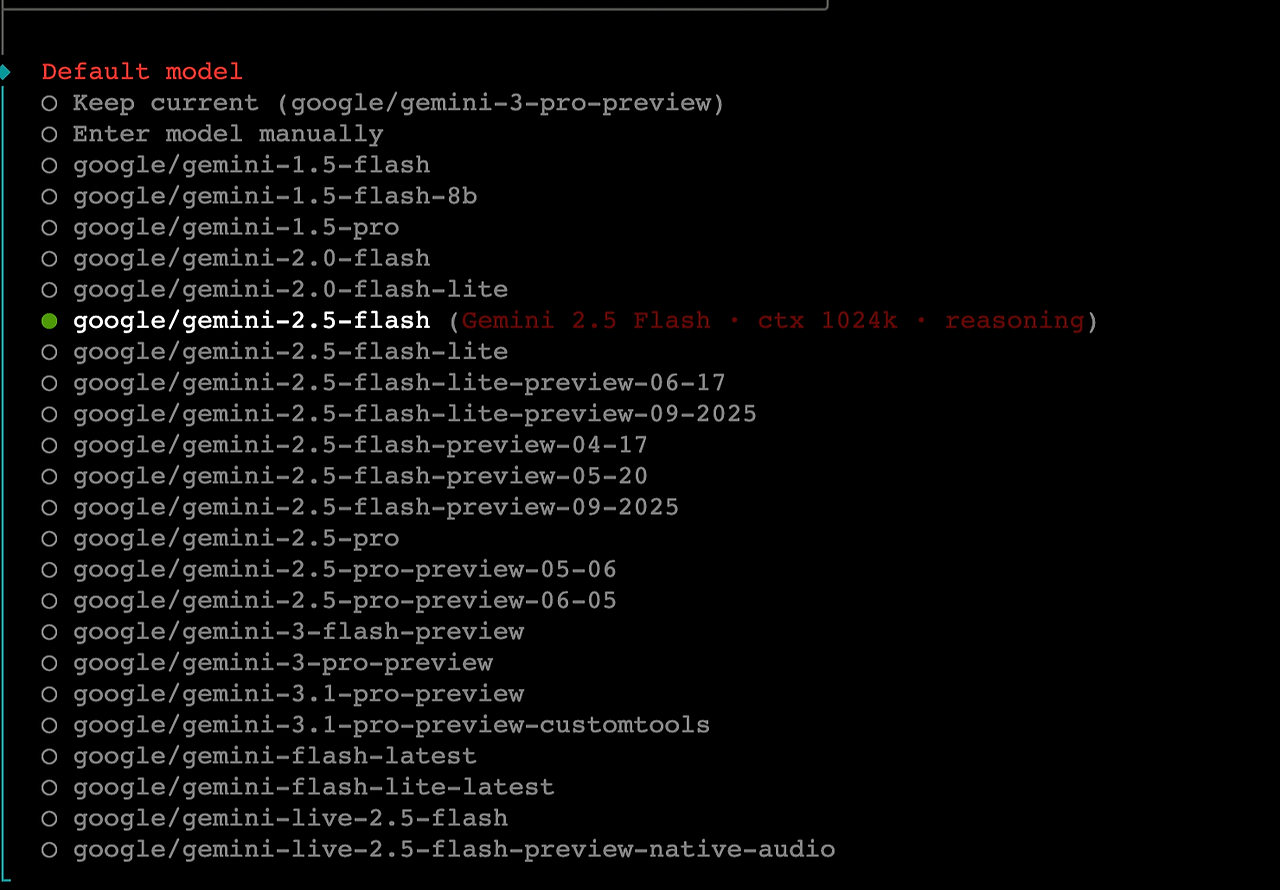 나는 제미나이를 써서 제미나이로 세팅한다. API키를 넣고 나면 어떤 엔진을 사용할지 문의한다.