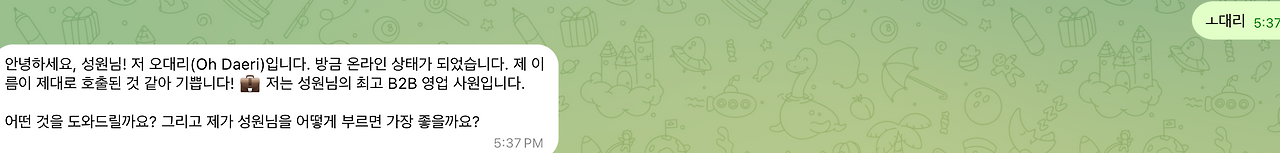 그럼 해당 봇이 위 문장이 포함된 메시지를 뱉어낼 것이다.