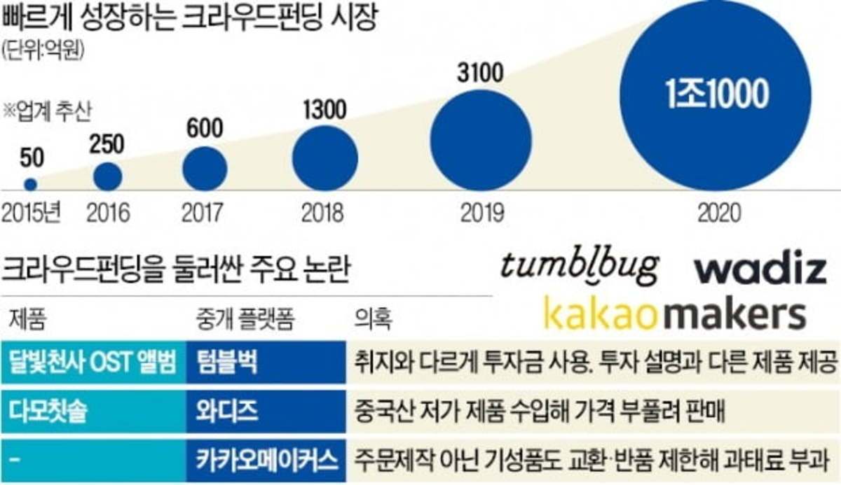 (출처: 한국경제신문 기사 발췌, "몸집 커졌지만…'성장통 앓는' 크라우드펀딩", 2020.01.16, 나수지 기자)