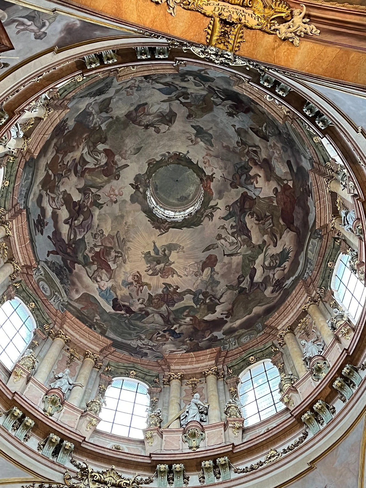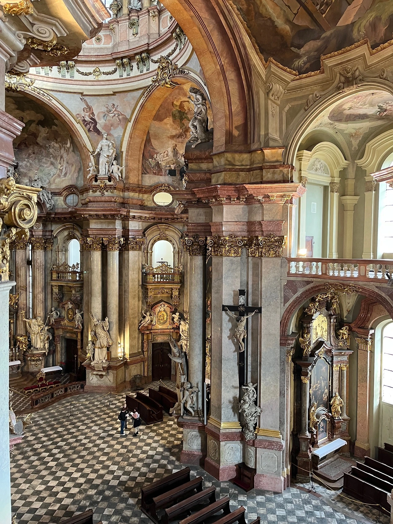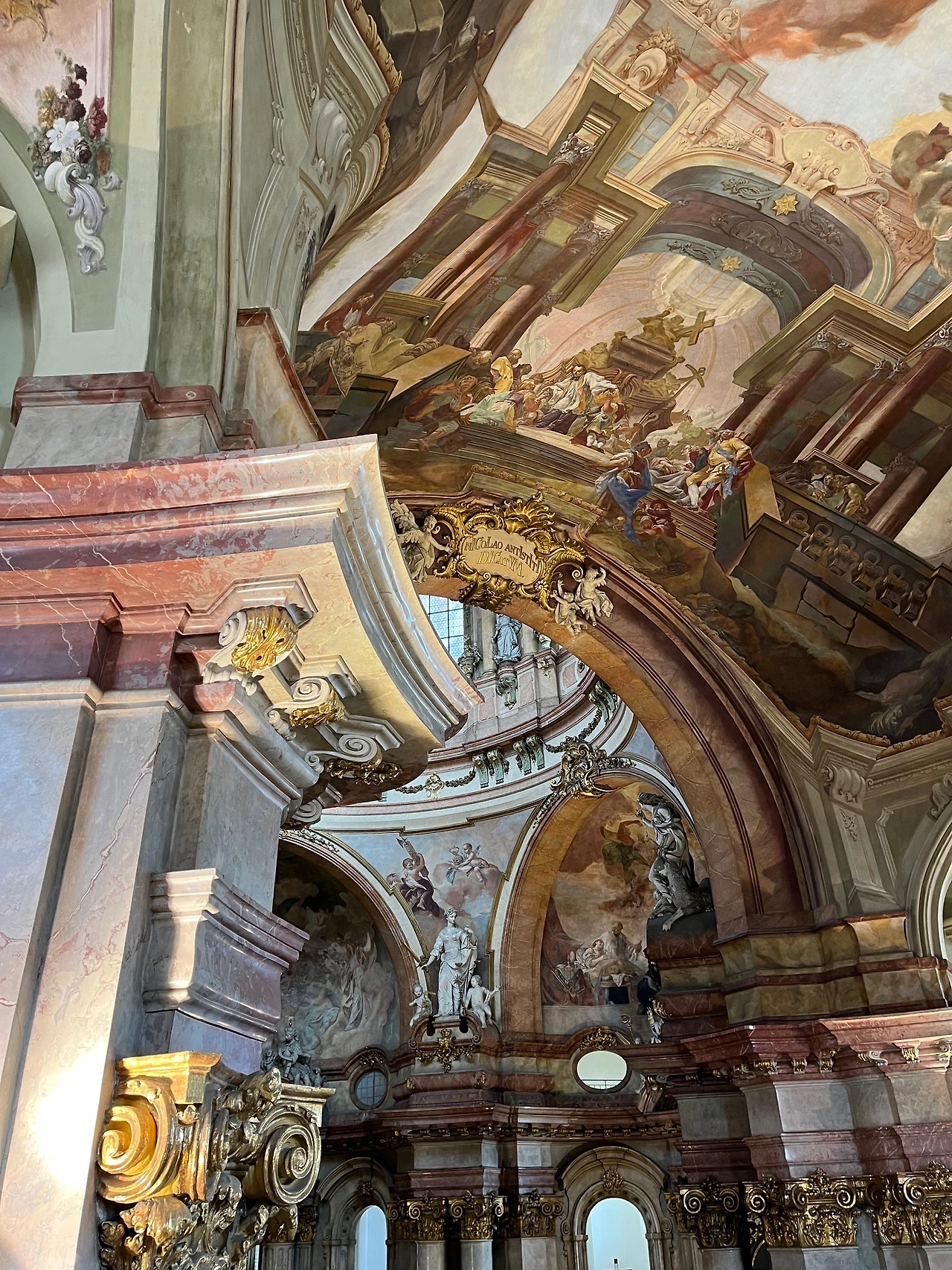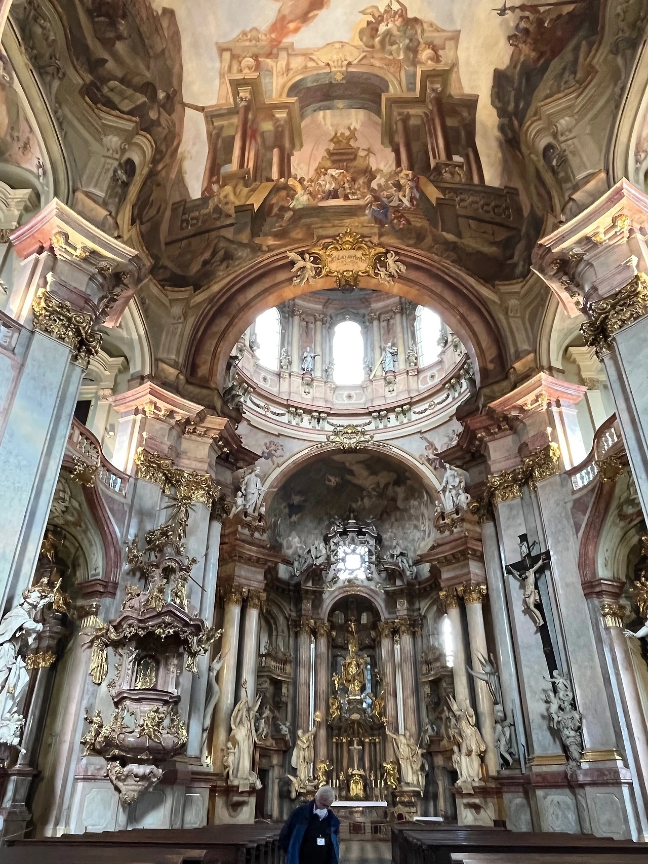 이곳은 블타바 강 왼쪽 편에 위치한, 까를교를 건너 작은 면에 속하는 말라 스트라나 구역이다. 까를교 오른편 강변에 카프카 박물관이 있고, 곧바로 올라 오른쪽에 프라하에서 가장 아름답다는 바로크 양식의 성당도 있다. 그 안으로 필히 들어서 보라고 말하고 싶다. 내부 궁륭 천장, 저 높은 하늘에서 신과 아기 천사들의 다채로운 향연, 벽면에는 온통 은색과 붉은 벽돌로 꾸며져, 그 표면의 자연스러운 물결무늬, 다중적 정열적인 곡선, 그리고 황금색 장식, 이 조화와 화려함, 그 아름다움은 도무지 눈을 떼지 못하게 만든다. 아이러니하게도 여기 사용된 대리석은 최초의 인조석이라는데 아쉬움과 동시에 놀라웠다. 시간에 쫓긴 나는 문지기의 친절한 기다림이 미안해져 뒷걸음질 쳐 밀려 나오면서도 그 황홀함에 홀린 눈을 뗄 수가 없어 고개를 내려놓을 수도 없었다.