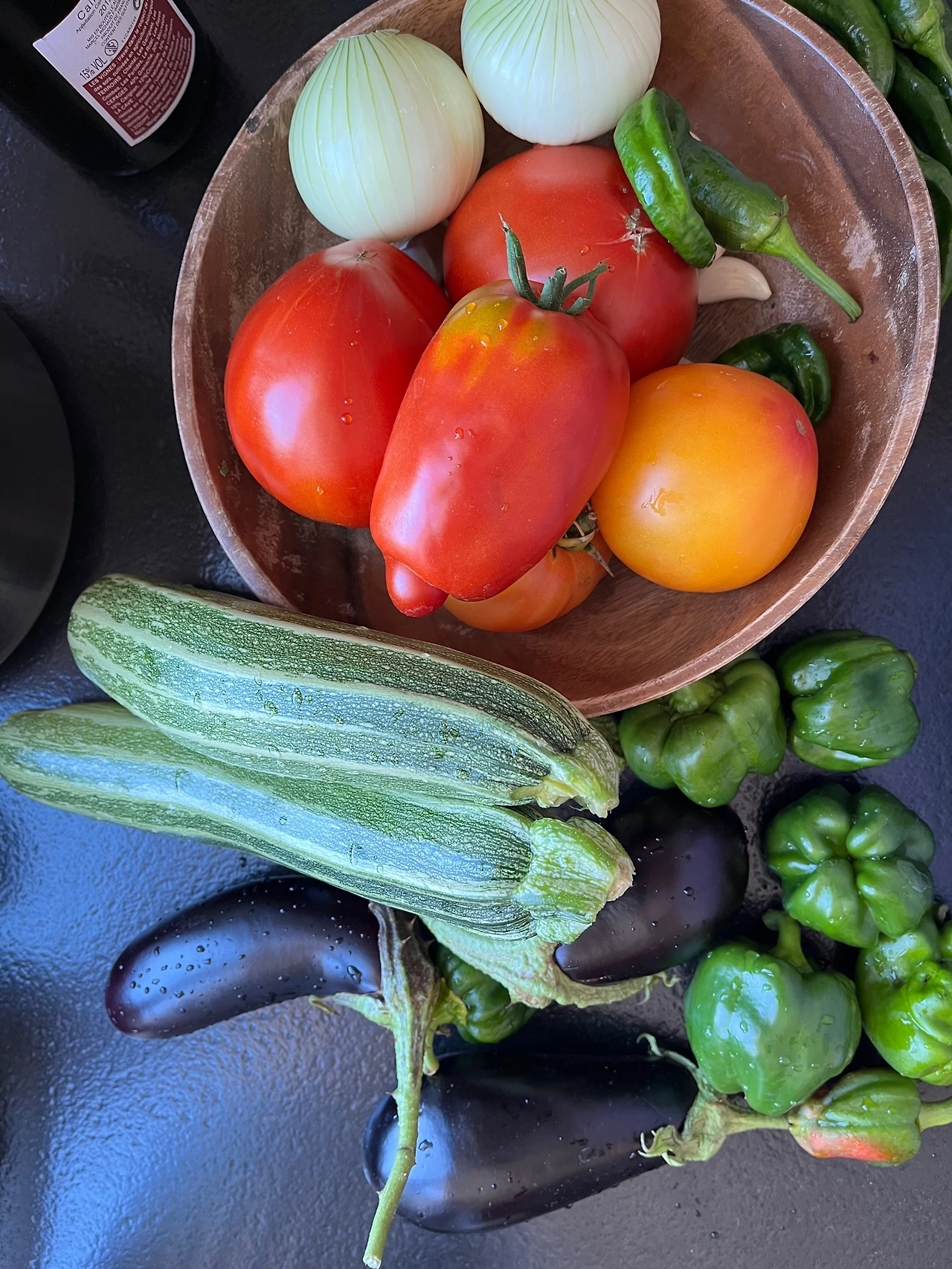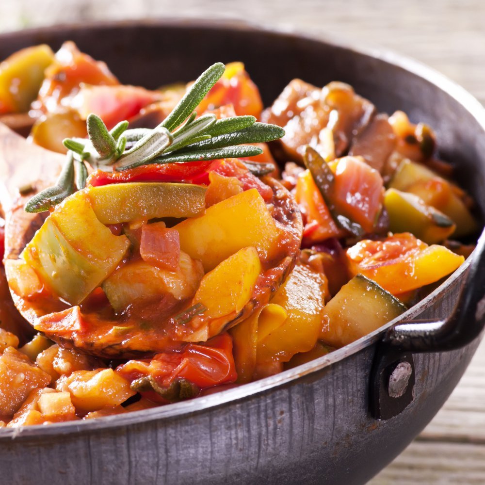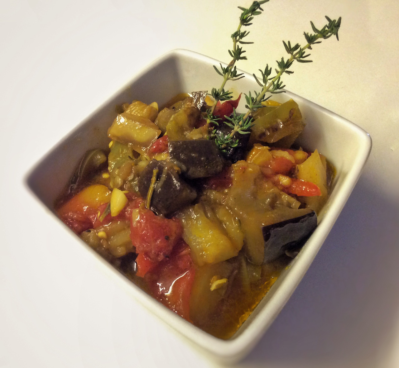 그리고 양파, 피망, 가지는 순서대로 적당히 굵고 크게 썰어서 각 종류별로 프라이팬에다 올리브유를 두르고 볶는다(마늘을 함께 넣어 볶아도 됨). 모든 볶은 야채는 토마토가 든 냄비에 담아 섞어준다. 이때 가지의 굵기는 0.3cm 정도 두께의 반달이나 둥글 모양으로 썰어야 빨리 익고 기름도 적게 먹는다. 하지만 꼭 법칙은 아니다. 이렇게 모든 재료가 담긴 냄비에 약간의 소금, 후추(통후추를 함께 사용해도 좋다), 월계수 한 잎, 딴 두, 세 가지를 넣고 뚜껑을 닫은 후, 약한 불에 반시간 가량 끓인다. 그러면 각종 채소가 혼합되어 깊은 맛이 절묘하게 어울려진, 푹 익힌 야채 스튜가 된다.