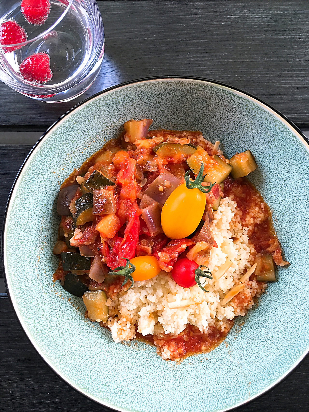 우리는 이 라타뚜이를 흰쌀밥에 올려 어린 양고기 숯불구이 한 덩어리와 함께 먹는다. 거기다 양념된 젓갈 같은 아리싸(Harissa;북아프리카 유대인들의 소스)에 찍어 먹으면 그야말로 여름철 완벽한 보양식이다. 가끔은 양고기 대신 돼지 갈빗살 또는 소시지 숯불구이, 가볍게는 구운 생선과 함께 먹어도 좋다. 그리고 오이장아찌 한 조각을 입에 넣으면 톡 쏘듯 새콤 달콤 짭조름한 맛이, 기름진 입 안을 쾌적하게 한다. 달달하면서도 감칠 나게 우려난 라타뚜이 맛과, 나무와 불 냄새가 속속들이 배인 부드러운 살코기의 육즙에, 적당히 맵고 짠 빨간 고추 젓갈, 하얀 쌀밥의 부드럽고 촉촉한 조화가 입안에서 은은하게 맴돌면서 소르베(Sorbet;아이스크림 같은 빙과)처럼 녹아든다. 이어서 그 특유한 맛이 멜로디처럼 가득히 터져 온 몸으로 진동한다. 거기에는 포도주가 절대 빠지면 안 된다. 한입 가득 씹어 삼킨 후 포도주 한 모금으로 다시 입안을 헹구면서 은밀하고 내밀한 맛으로 되새김질한다.