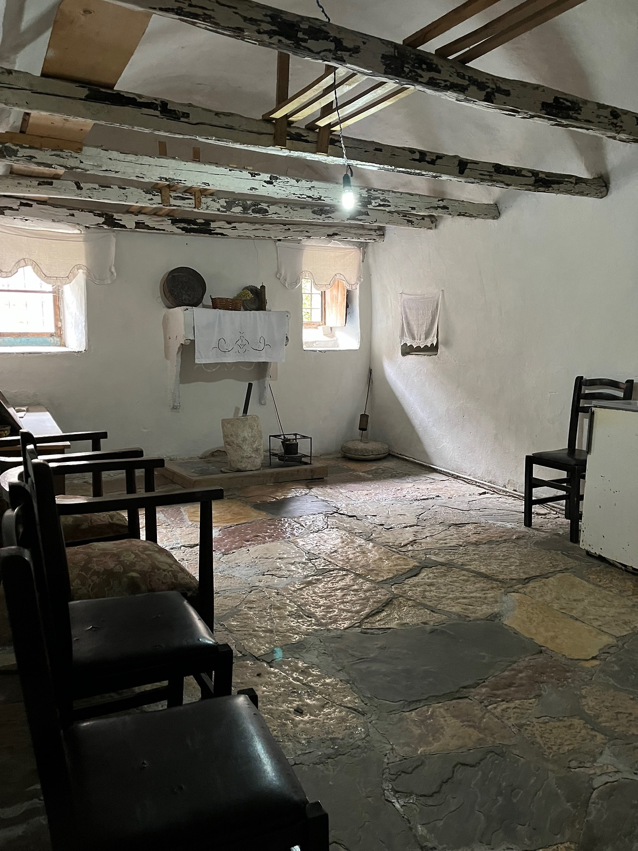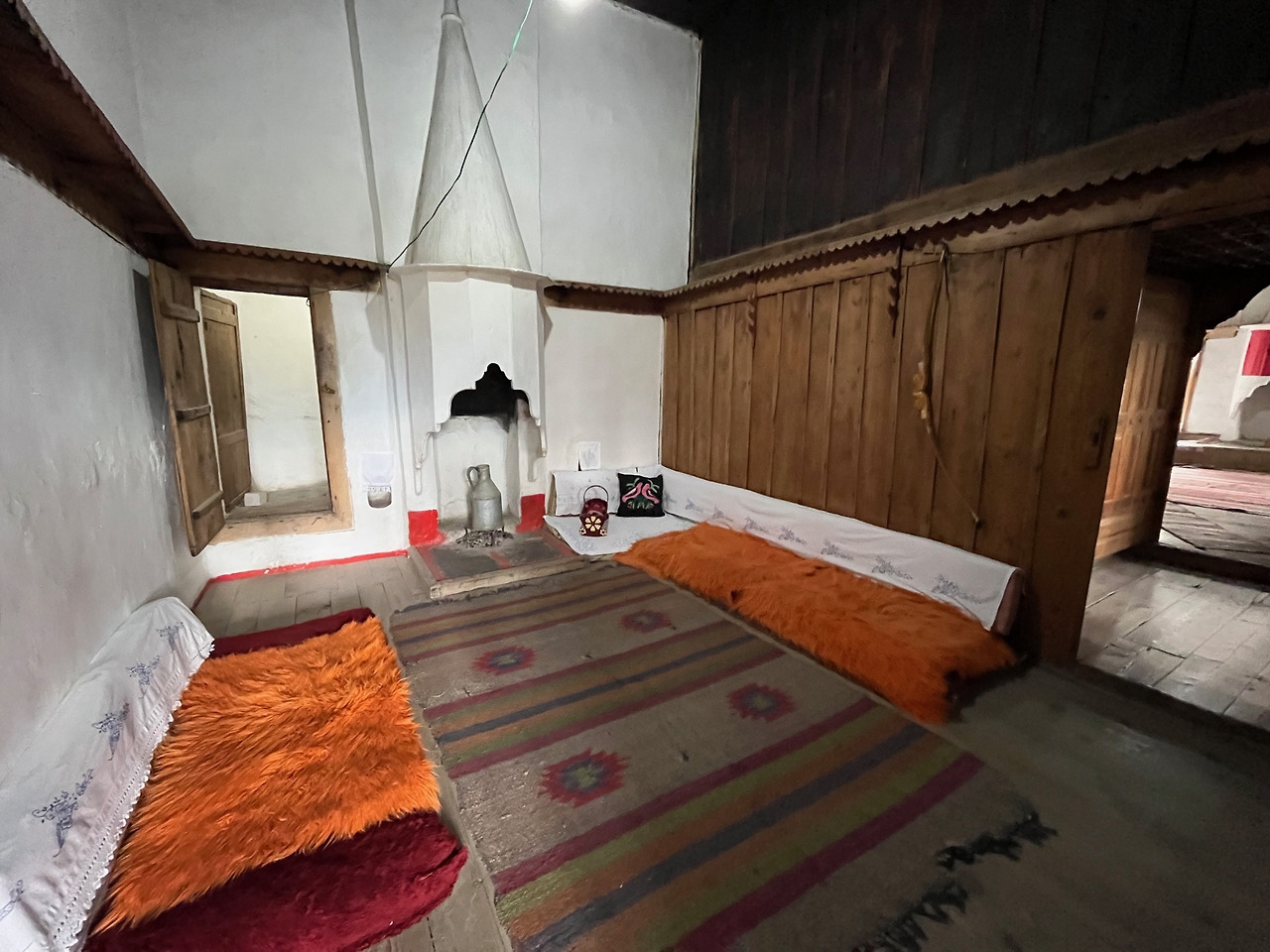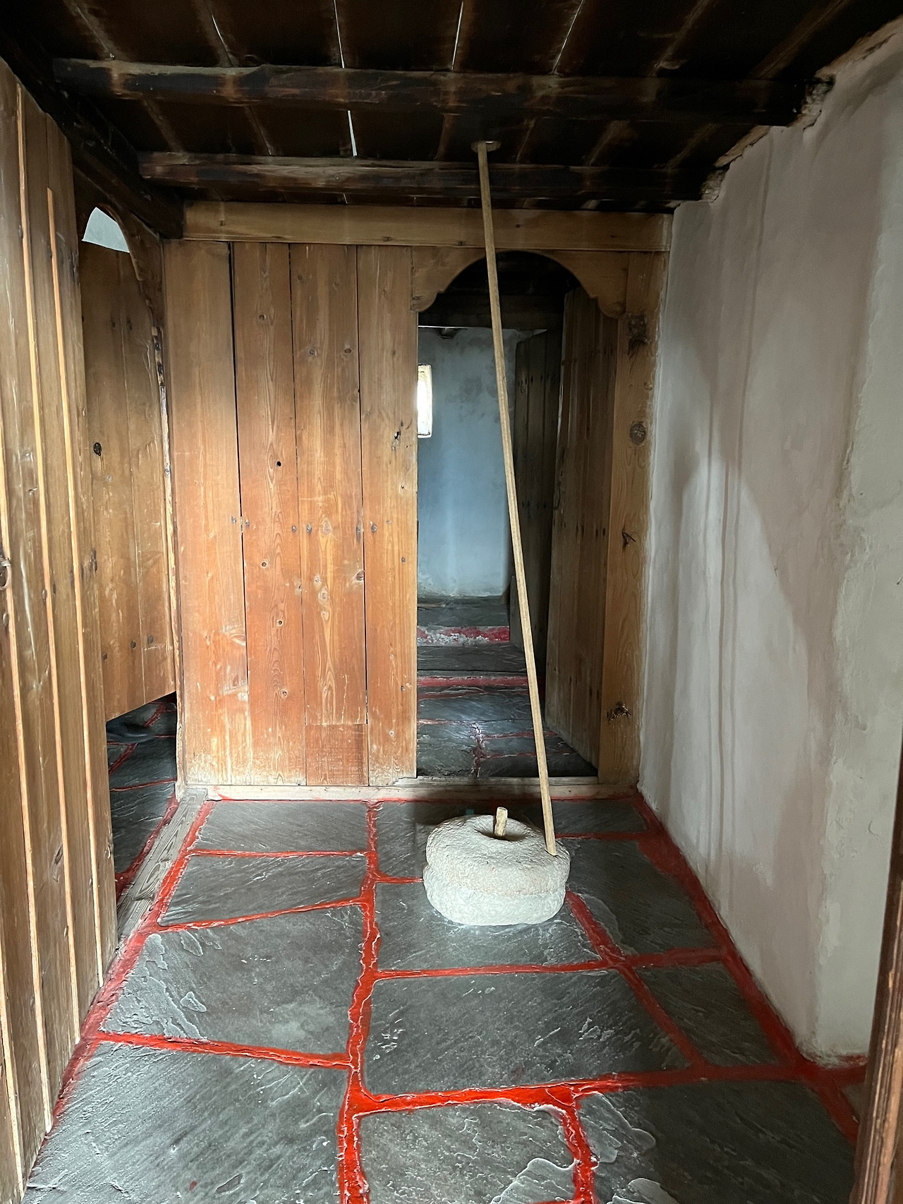 우리는 안으로 들어갔다. 관람객은 우리 둘 뿐. 조용해서 천천히 감상할 수 있어 좋았다. 일층과 이층은 겨울나기 위한 공간으로 널따란 입구와 함께 중앙에 커다란 실내 마당 같은 거실을 두었고 왼쪽 큰 방에는 각종 공구와 식량을 보관하는 광, 가운데 맞은편에 우물과 커다란 아궁이가 있다.