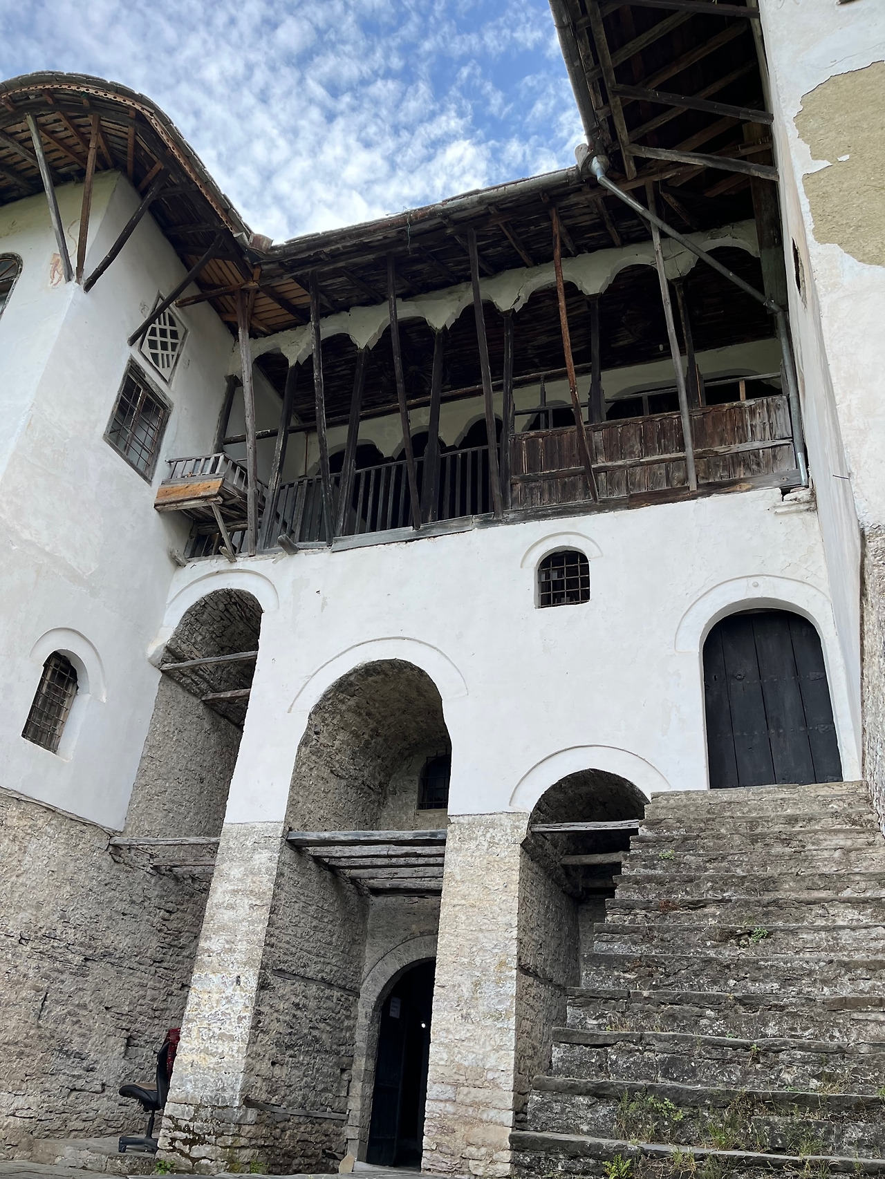 대문을 들어서니 무화과나무가 가지를 뻗어 무성한 잎으로 담장을 가리고 있었다. 빈 가옥은 비록 세월의 때가 묻어 낡고 허름하나 위풍당당했다. 건축미 또한 멋스러우면서 우아하다. 4층으로 된 건물은 위엄 있고 아주 높은 반면 마당은 넓지 않다. 대체로 생활 자체가 실내에서 이루어졌기 때문이지 않을까 생각한다. 집의 하부 영역은 돌로 만들어졌고, 그 위에 목조 구조물이 세워졌으며, 좌우 두 개의 탑과 같은 날개로 나누어져 정면의 긴 아치들에 의해서 서로 연결되어 있다.