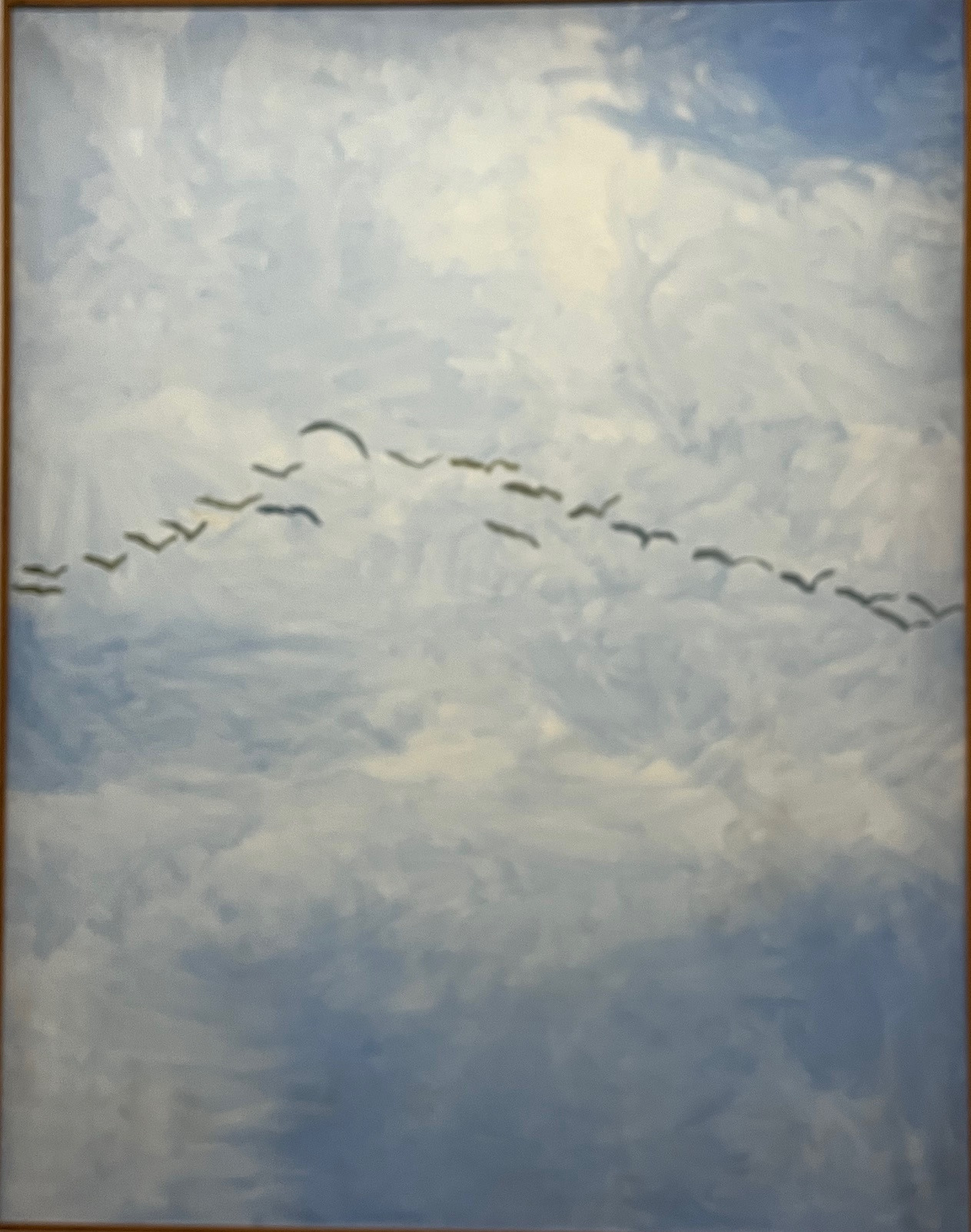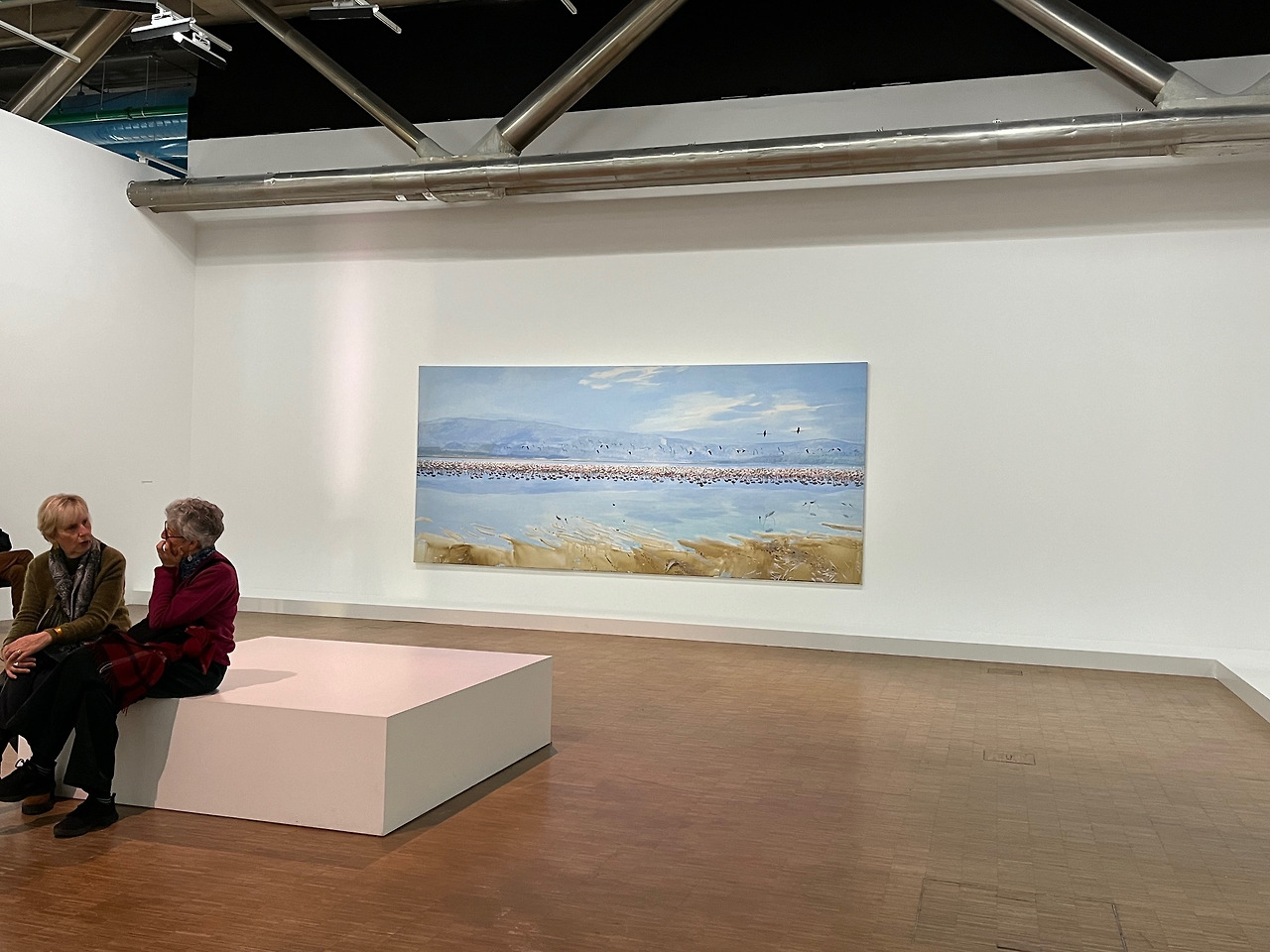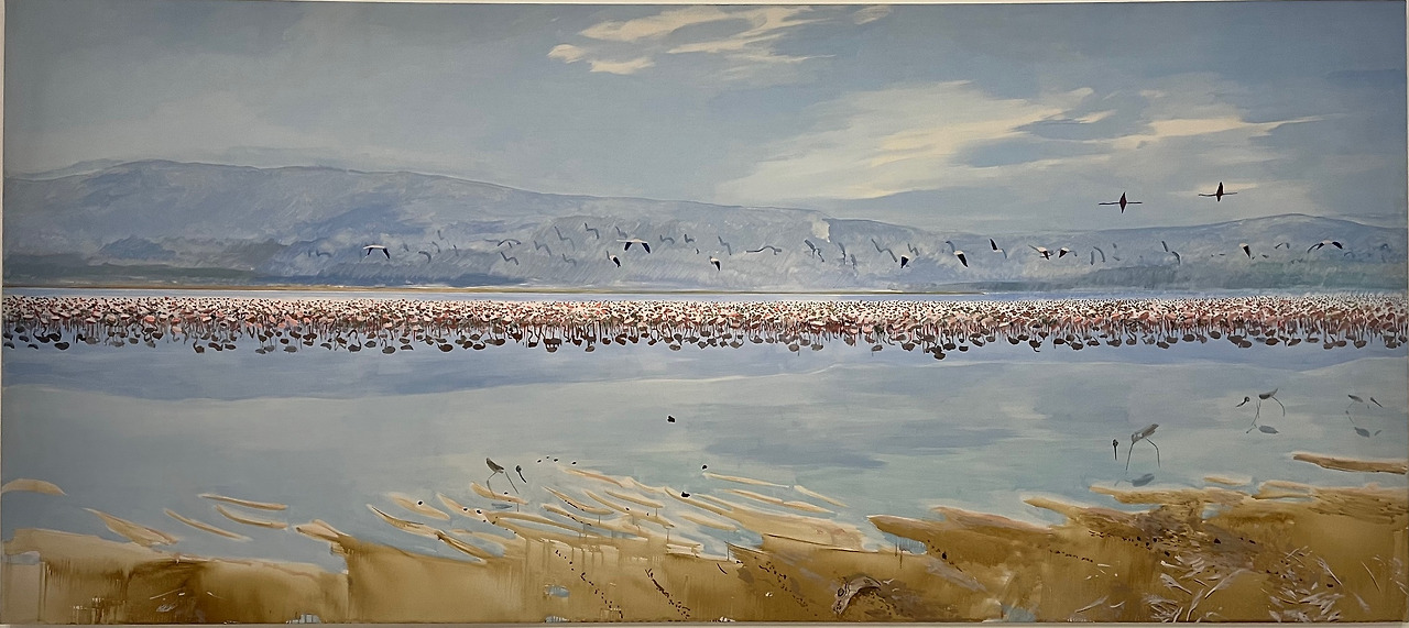특히 <나쿠루 호수의 새 떼, 1990>에서 하늘과 물, 무한히 겹쳐지는 플라밍고, 수평 시트처럼 아주 가벼운 공기의 진동 같은 느낌. 이 섬세함과 자유롭게 펼쳐지는 필력, 춤을 추는 듯한 제스처의 붓놀림은 마치 물 위에서 먹이를 찾던 플라밍고 떼들의 여린 긴 다리가 사뿐사뿐 살아서 움직이는 것만 같다. 가히 장관이다. 혹여 내가 작품에 가까이 접근했다가는 금방이라도 날갯짓하여 모두 날아갈 것만 같았다.