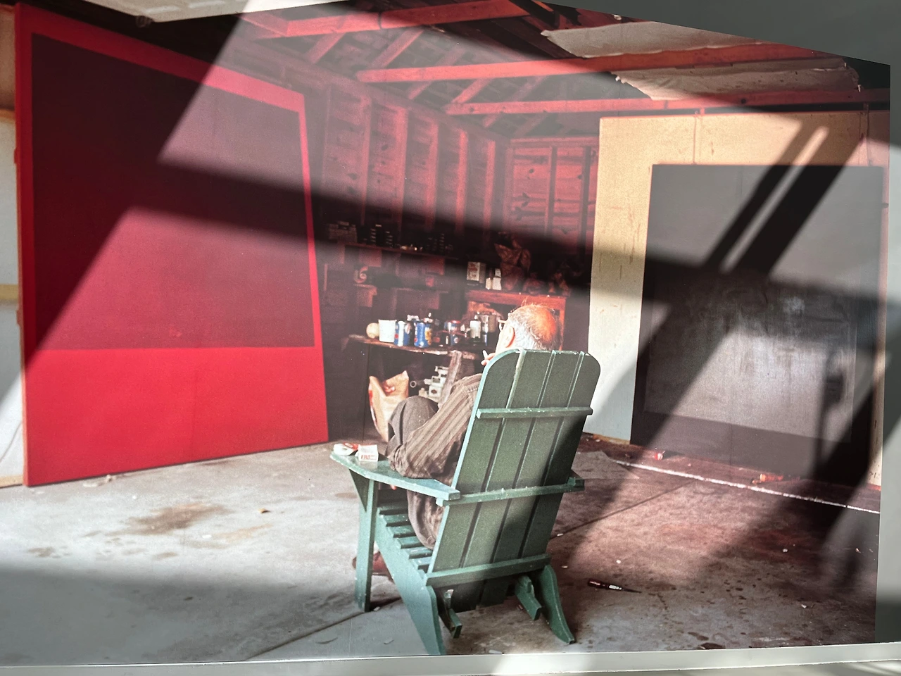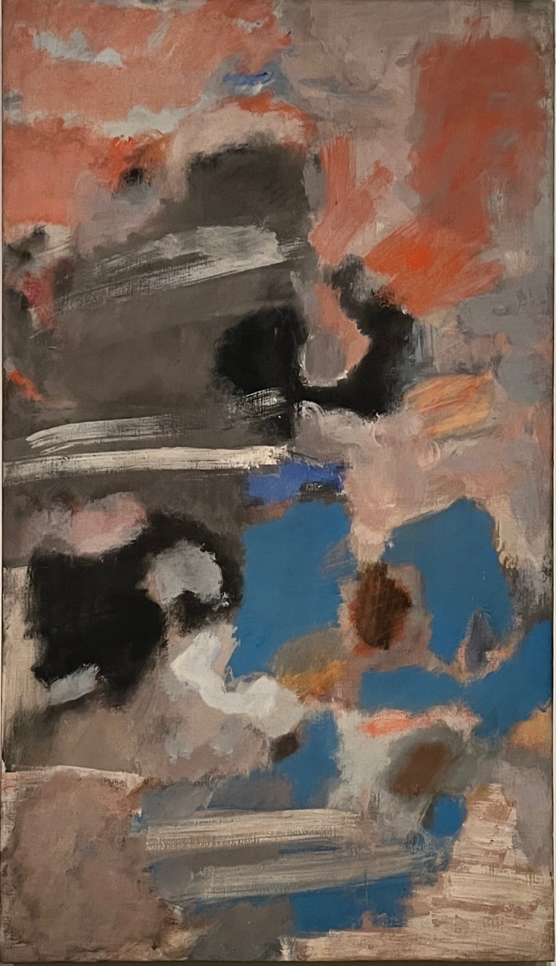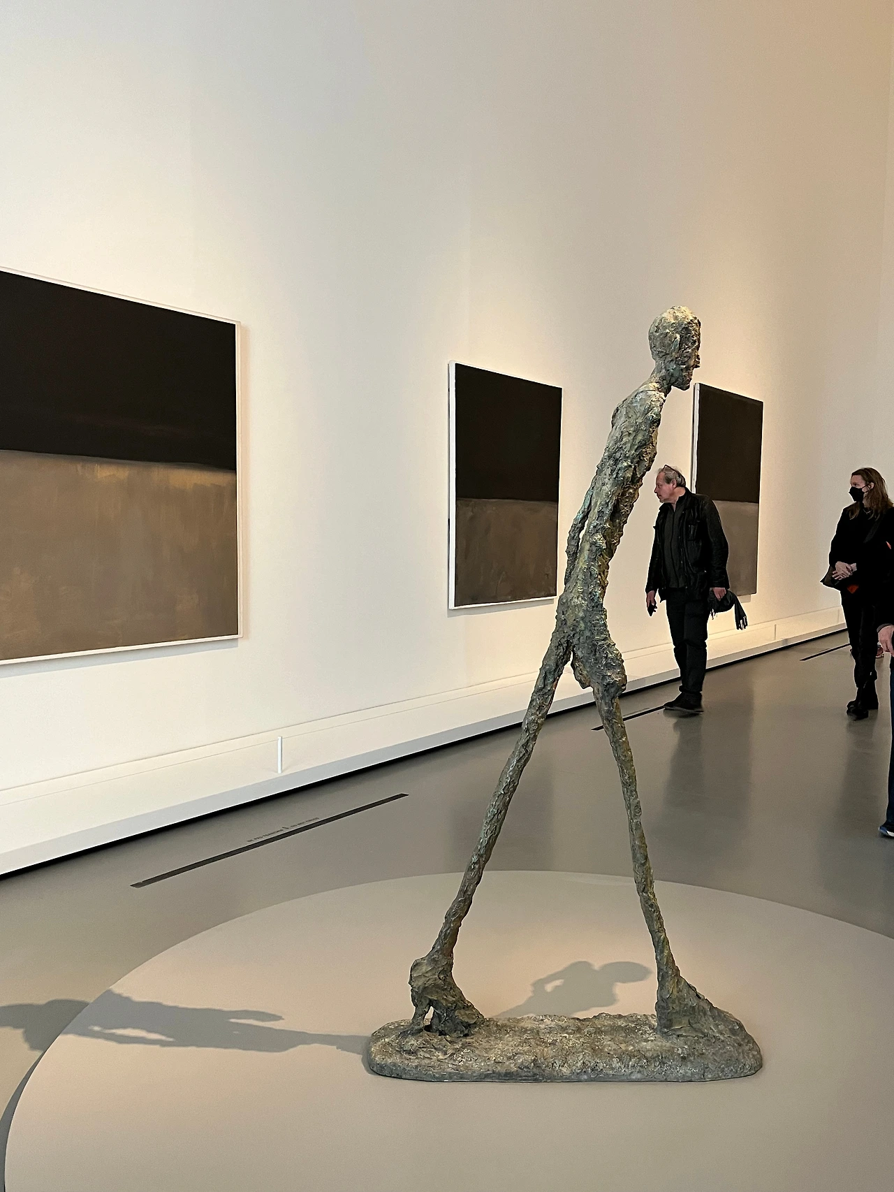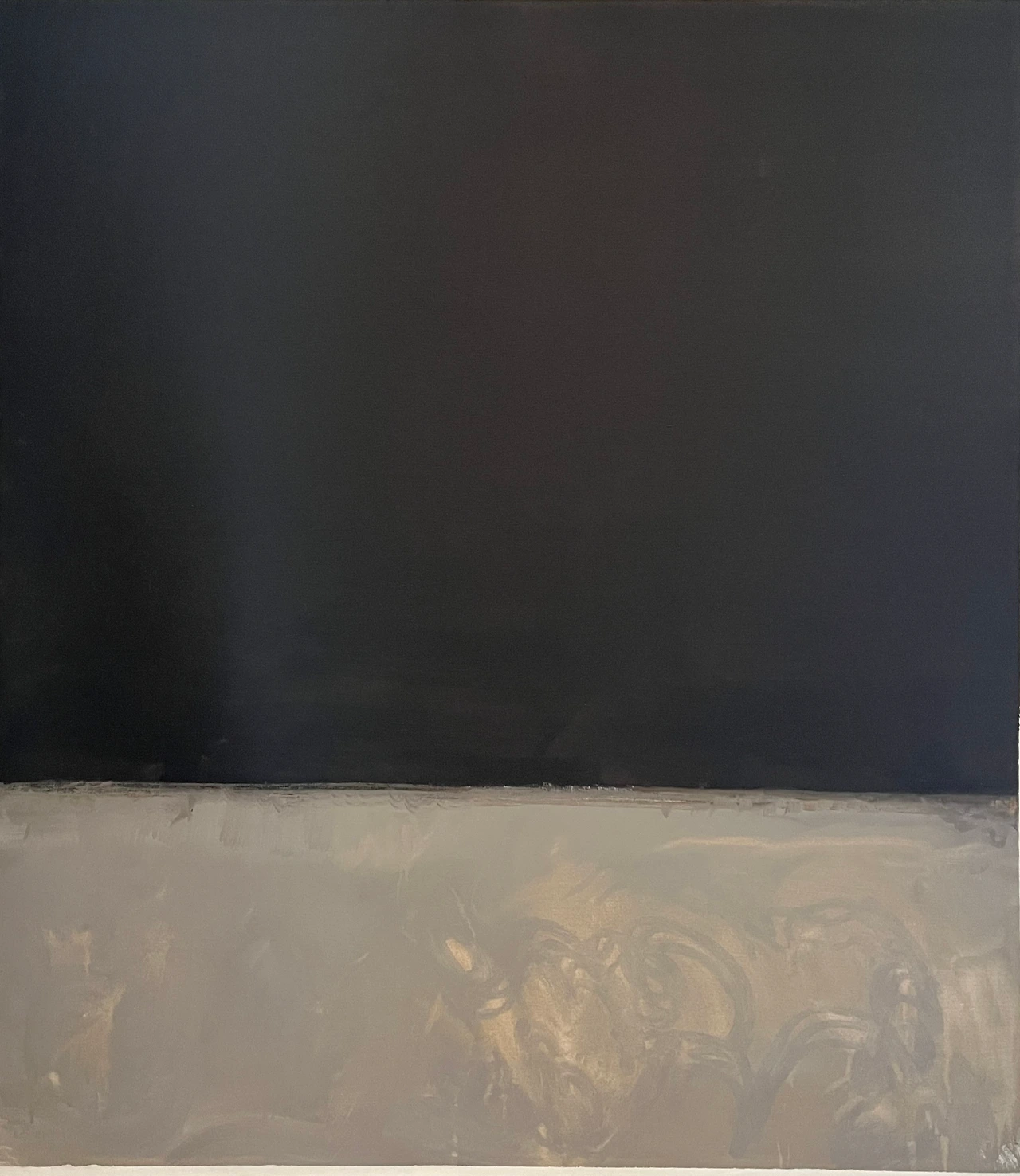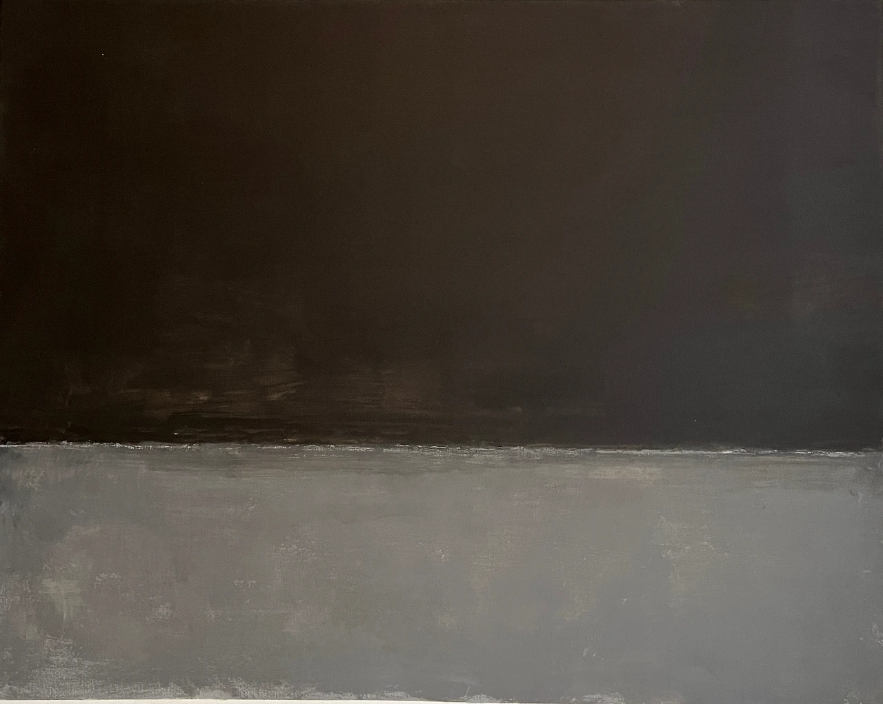 이 전시 마지막 방에 자코메티의 조각품과 함께 배치해 놓은 회색과 검은색으로 분할된 수평의 작품이 그의 말년 작업이다. 이전의 작품에서는 몇 개의 직 또는 정 사각형 틀로 영역을 확장했다면, 이 작품은 틀을 없애고 화면 밖으로 이어지는 대칭적 수평 형식이다. 앞선 구성보다는 열린 느낌을 주었다. 그렇지만 오직 회색과 검은색의 대칭 분할에서 나는 더 이상의 큰 변화감을 느끼지는 못했고, 암울한 긴 밤의 악몽을 연상시키면서 무겁고 답답하여 우울하게 느껴졌다. 특히나 자코메티의 작품과 함께!