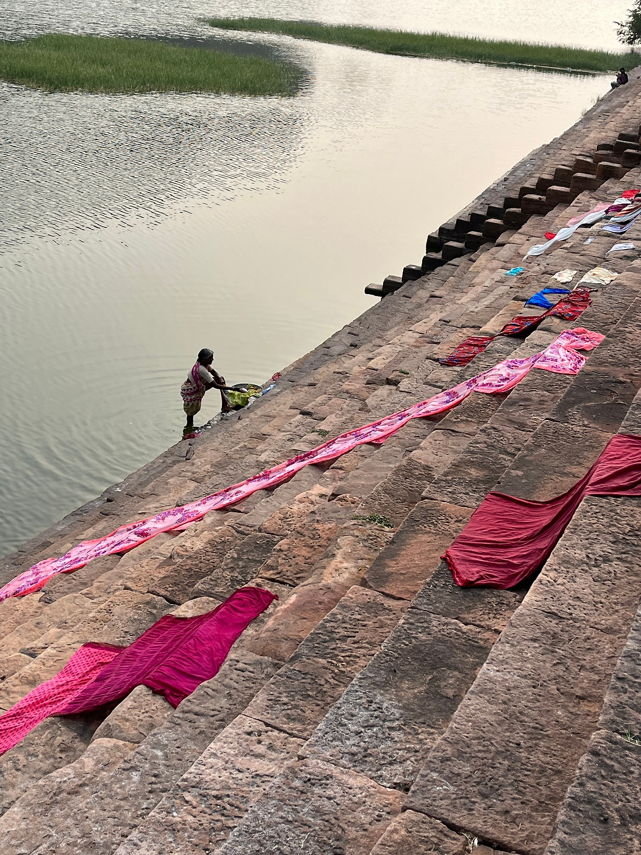 우리는 동굴사원을 오르기 위해 호수가의 계단을 따라 걸었다. 주변의 돌을 깎아서 만든 거대한 붉은빛 돌계단. 치맛자락을 허리춤에 뭉쳐 올리고 호수물에 발을 담근 아낙이 빨래하는 모습은 참으로 오랜만에 보는 정겹고도 인간적인 모습이었다. 마치 내 어린 시절 냇가에서 방망이질로 빨래하던 모습과 크게 다를 바 없어 보이지만, 이들은 방망이대신 빨랫감을 돌 위에 내리친다. 그리고는 계단 위에다 펼쳐서 말리는 색색의 빨랫감은 무릇 대지예술을 연상케 했다.