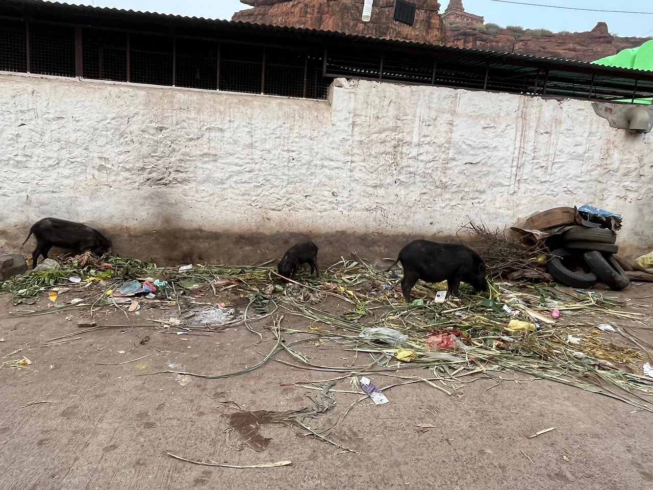 바다미시에는 아주 훌륭한 석굴사원이 있다. 이 번잡한 중심가를 약간 벗어나 시장통을 거쳐 마을 뒤쪽 골목길을 따라가면 사람 사는 진솔한 모습의 전통가옥들이 옹기종기 모여있다. 나지막한 테라스식 지붕, 출입문마다 꽃으로 엮은 금줄이 매달려 있으며, 그 앞 빨랫줄에 늘린 옷가지들, 살림살이, 현관 앞에서 집안일을 하는, 사리를 입은 여인과 아이들의 모습도 보인다. 현관 지기 같은 염소와 골목에 풀어놓은 돼지들이 쓰레기 더미에 코를 박고 있는 것도 전형적인 시골 삶의 풍경이다. 채식가인 힌두교 마을에서 돼지와 연관성이 궁금했다.
