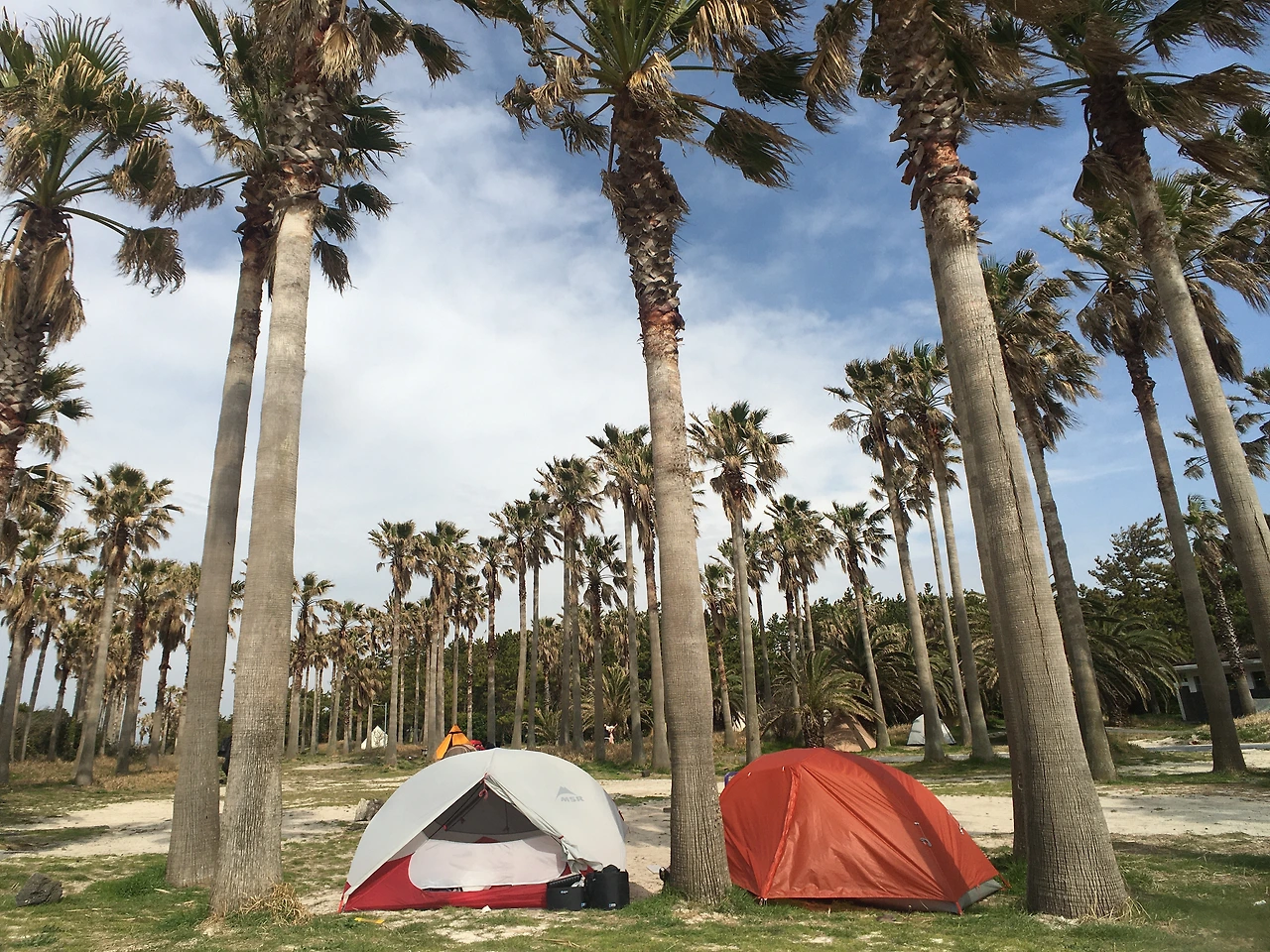 그렇게 홀로 제주도를 이리저리 돌아다니며 친구를 기다렸다. 친구는 저녁이 되어서야 제주도에 도착했고 각자 숙소에서 자고 금능해변으로 가기로 했다. 푸른 바다 물빛보다 휘날리는 모래 알갱이가 내 얼굴을 때렸다. 신나게 뛰어다니며 오늘 우리가 잘 수 있는 장소를 찾아다녔다. 이리저리 편하게 쉬며 풍경을 즐길 수 있는 장소를 유심히 찾았다. 바람이 날리는 그 과정에서도 우리는 텐트를 쳤다. 친구는 돌멩이를 주워오더니 마구마구 팩 다운을 해댔다. 멋있었다. 휘날리는 바람에 모래들이 텐트로 마구마구 들어왔지만 걸스카우트 야영 온 초등학생 마냥 신이 났다. 그렇게 생애 첫 텐트를 제주도에 팩 다운했다. 비행기를 타고 몇 시간을 달려야 볼 수 있을 것 같은 야자수에 무섭게 치는 바람들과 싸우며 텐트는 잘 지어졌다. 몇 년간 백 패킹했던 친구는 만두와 감바스 밀키트를 챙겨서 이것저것 만들어주었다. 장비도 빌려주고 음식도 만들어 준 내 친구는 천사였다. 친구에게 맛있는 커피를 내려주고 싶어 드리퍼와 그라인더를 챙겨 왔다. 그리고 ‘snowpeak’ 컵에 커피를 여유롭게 마셨다.