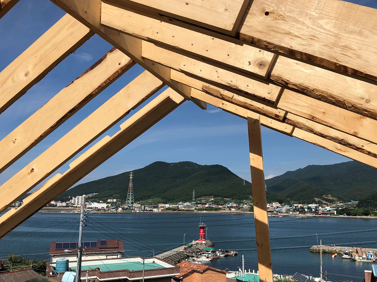 마룻대 양쪽으로 착착 서까래(Rafter)가 걸렸다. 서까래는 지붕의 하중을 지지하기 위한 지붕 구조재이다. 서까래에도 벽체에 쓰인 것보다 넓은 목재가 사용되었다. 서까래는 갈빗대 같은 모양이었다. 마룻대와 서까래, 그리고 그 외의 부수적인 지붕 구조목을 설치하고, 남은 벽체를 마저 세우니 집의 뼈대가 완성되었다. 완성된 구조는 그 자체로 하나의 공예품 같이 아름다웠다. 이 구조재는 집안의 뼈대와 같이 중요한 것이지만 안팎으로 마감을 하기 때문에 지금 이 공정이 지나면 다시 보기 어렵다. 괜히 아쉬워서 가만히 냄새도 맡아보고, 쓰다듬어도 보았다. 좋은 향이 났다.