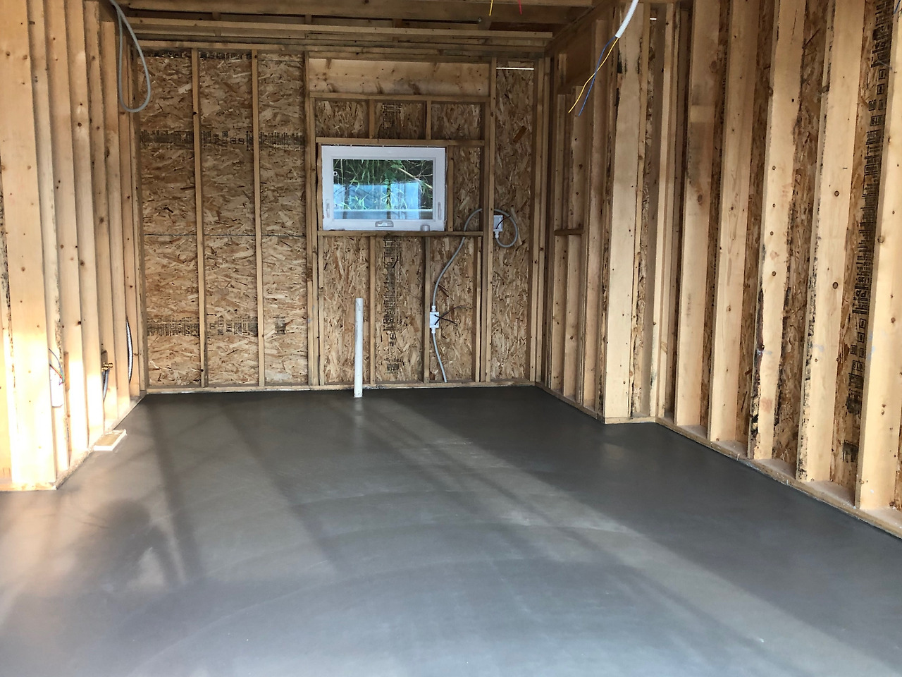 다음 날에는 콘크리트를 기초 구조목 높이까지 부어 단단한 바닥 층을 만들었다. 이 작업을 방통(방바닥 통 미장)이라고 한다. 화장실이나 현관 같이 단차가 있는 곳은 높이를 두어 시공하였다.
