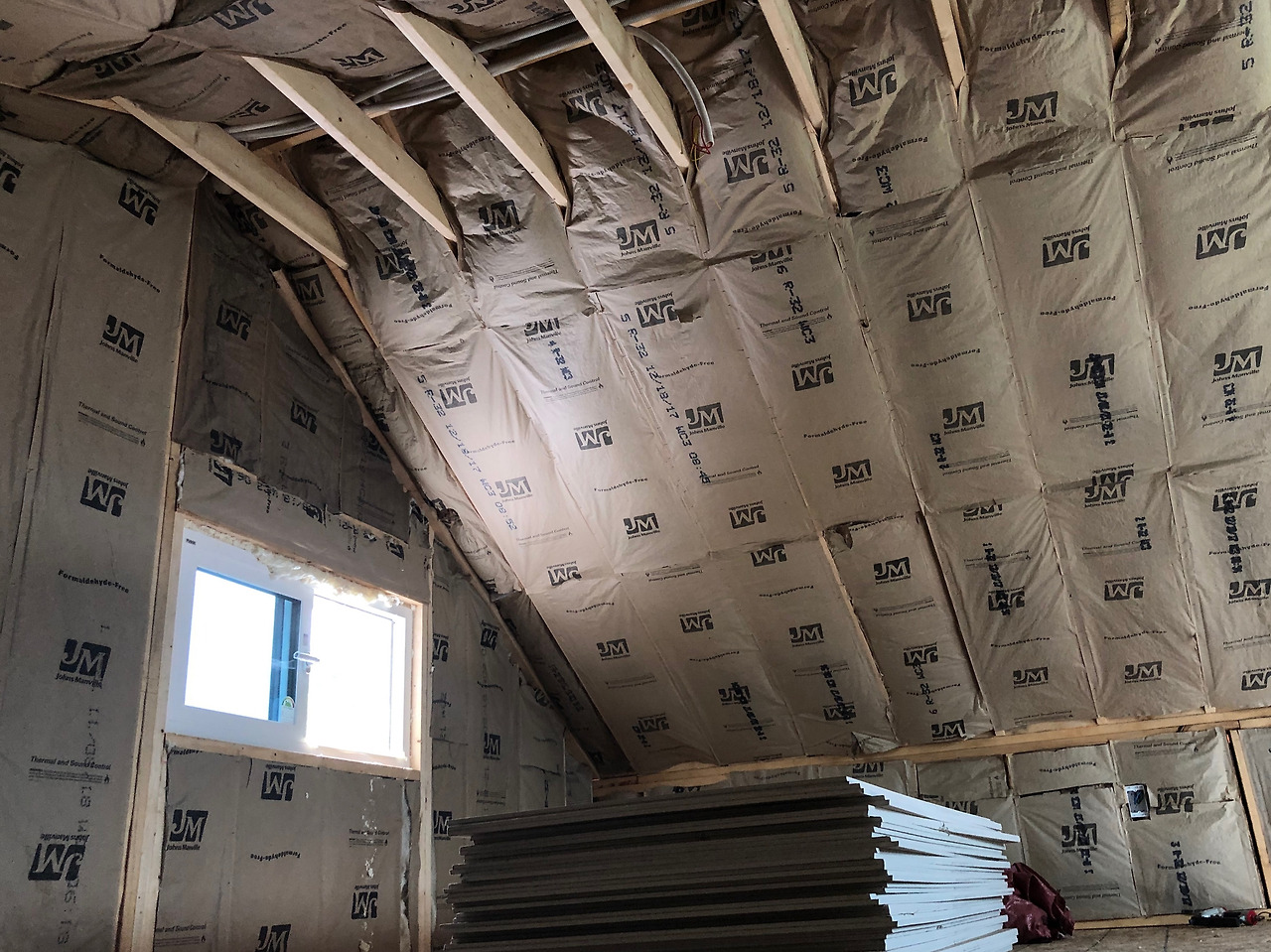 방통 작업이 마무리된 지 이틀이 지난 후 단열 작업에 들어갔다. 벽체와 지붕의 기둥 사이사이에 단열재를 채워 넣고 그 위에 합판을 덮어서 내부 벽면을 만드는 작업이다. 에너지 효율이 좋은 집을 짓기 위해 가장 중요한 공정이라고 할 수 있다.