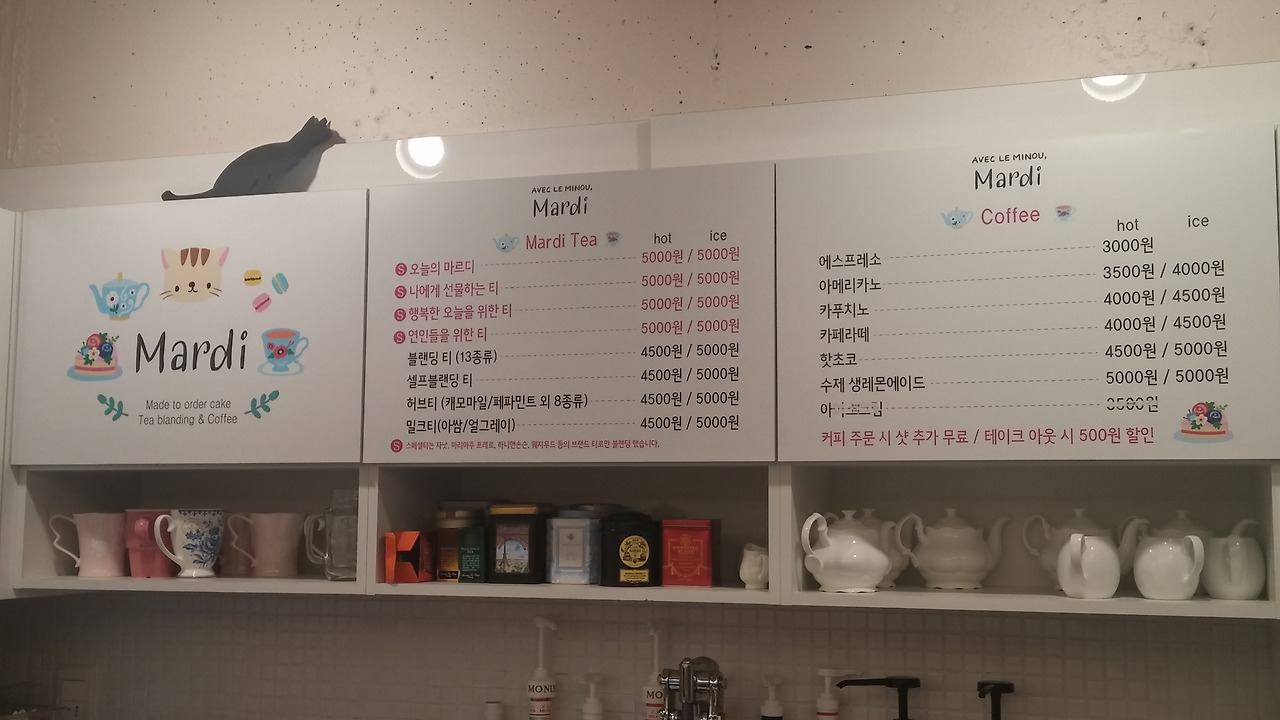 마르디 카페 푯말..허브티와 케이크, 홍차도 있어요