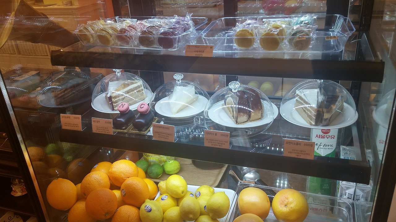 마카롱과 조각 케이크, 신선한 과일..식욕 돋네요^^