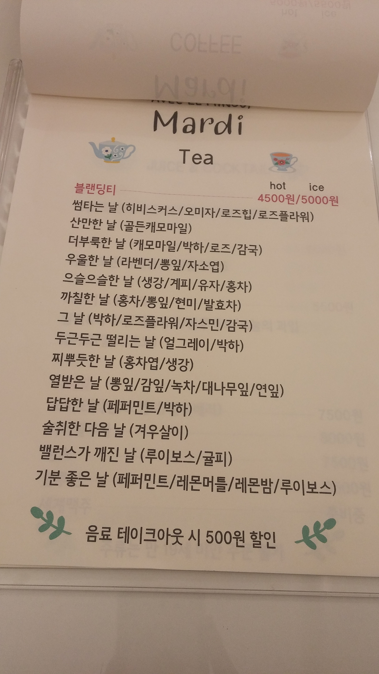 메뉴판, 감성돋는 티 이름이 눈길을 끌어요