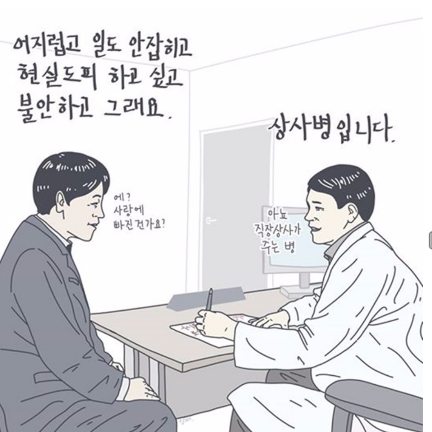 페이스북에 올리고 있는 <약치기 그림>에서는 회사에서 하고픈 말 못하고 혼자 있고 싶은 직장인의 증세를 ‘일하기싫어증’이라 일컬으며 직장인의 공감대를 얻어냈고, 기분에 따라 제멋대로 명령을 바꾸는 직장상사로 인해 얻은 화병을 ‘상사(上司)병’이라고 하는 등 재치있는 신조어까지 만들며 불안한 시대를 살아가는 웃픈 직장인에게 힐링을 전합니다.