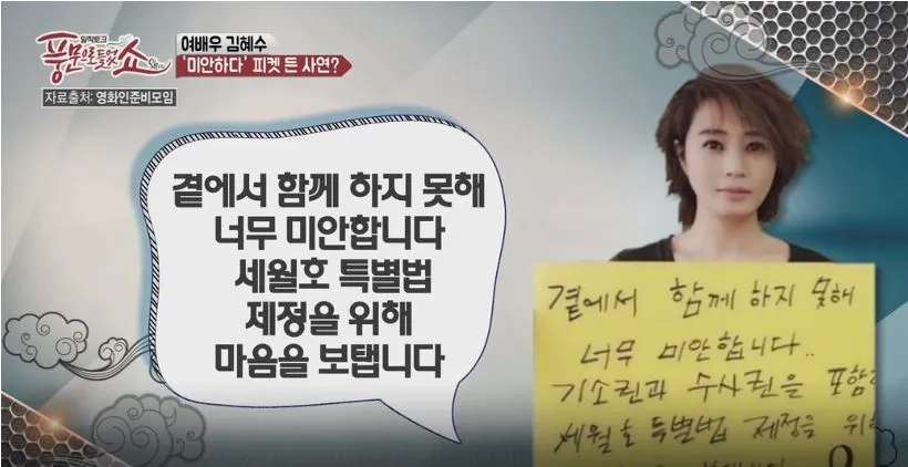 김혜수 역시도 2014년 추석 때 세월호 유가족에게 송편 150인분을 보내 화제가 됐고, 이어 '곁에서 함께 하지 못해 너무 미안합니다. 세월호 특별법 제정을 위해 마음을 보탭니다'라는 문구가 적힌 피켓을 든 사진을 공개한 적이 있었어요.