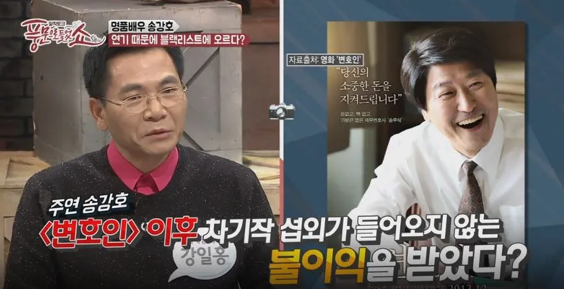 이어 블랙리스트에 명단이 오른 송강호의 경우, 노무현 전 대통령을 떠올리게 하는 영화 <변호인>의 주연을 맡았던 지난 2013년 이후 차기작 섭외가 들어오지 않는 불이익을 받지 않았을까 하는 의혹도 제기됐습니다.