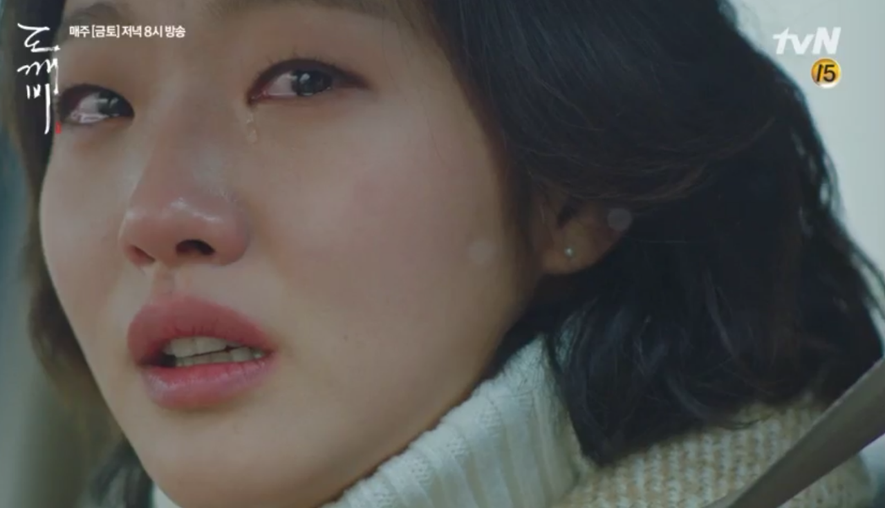 특히, 도깨비와 결혼식을 치르고 달콤했던 신혼도 잠시, 자가 운전 중에 경사진 언덕에 브레이크가 고장난 공사장 트럭이 어린이집 차량과 주변에 선 수 십명의 아이들의 죽음을 막기 위해 스스로 죽음을 택하게 되며 시민들로부터 '의인', '천사'라는 칭찬을 받지만, 홀로 남겨진 도깨비신은 마치 인간처럼 상실의 슬픔에 사로잡혔죠.