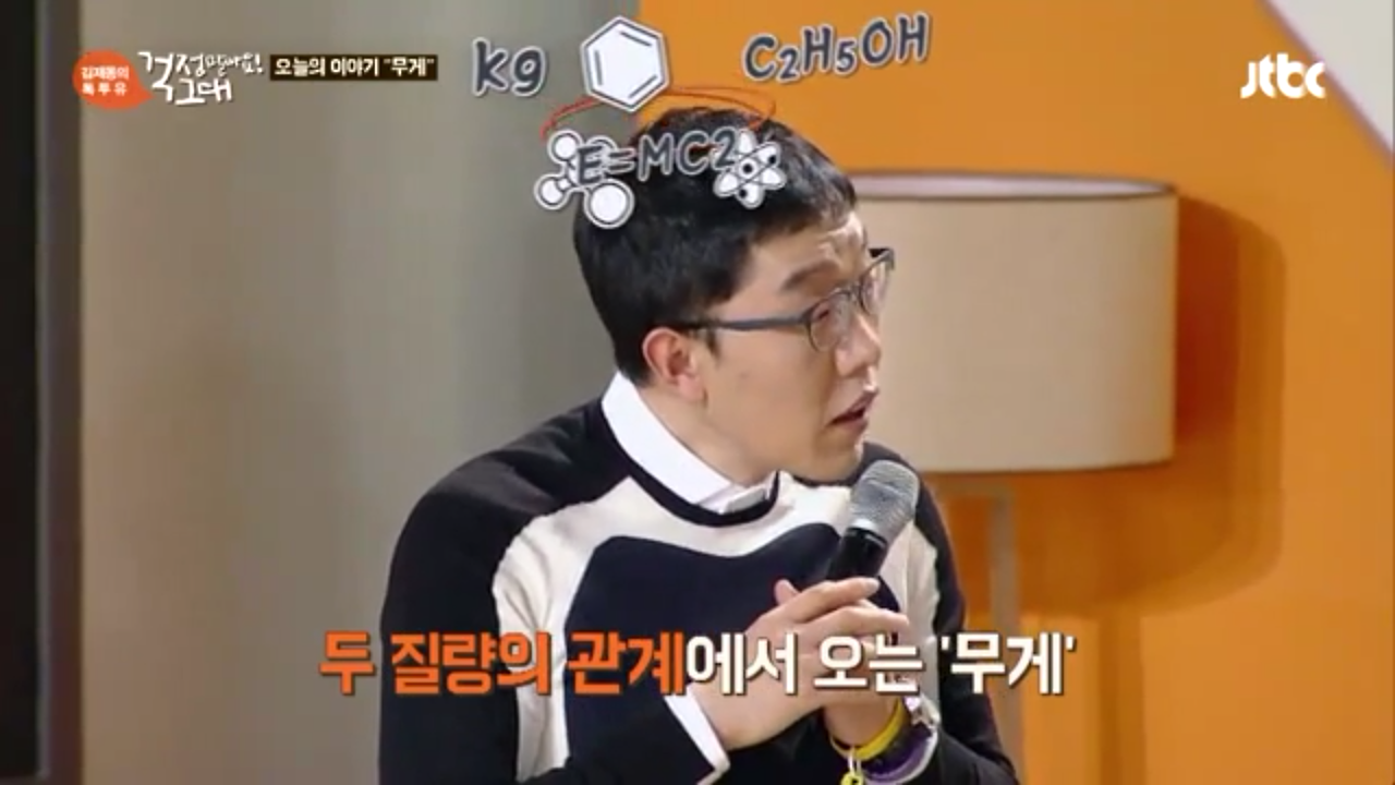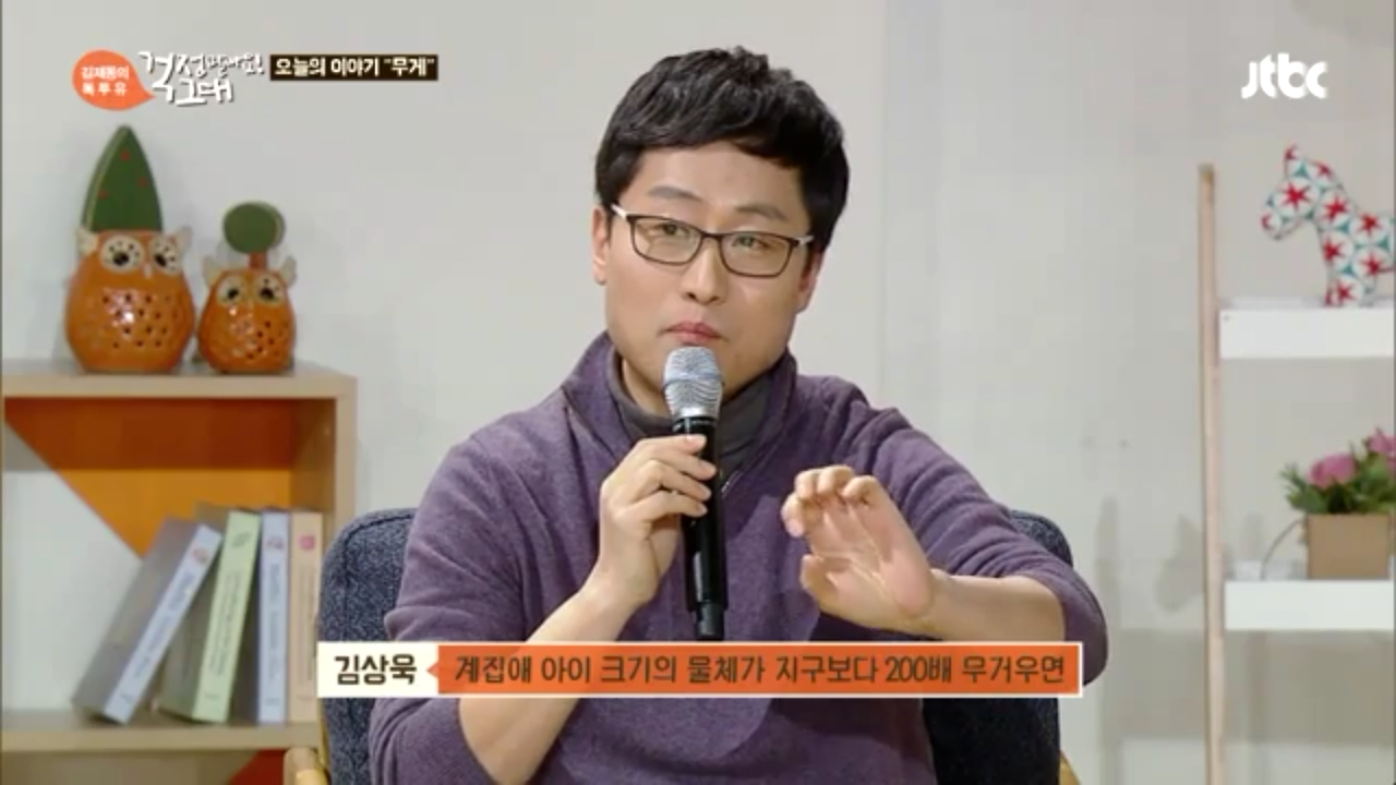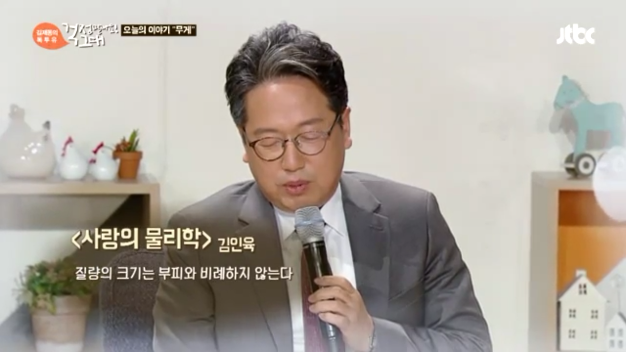 정 교수가 시를 소개하자 물리학자인 김상욱 교수는 "물리학에서는 무게와 질량을 구분해서 얘기한다"며 "질량을 가진 것은 그 주위에 중력장이 생기는데, 중력장 안에 질량을 가진 또 다른 물체가 생기면 중력을 느낀다"며 설명을 이어갔죠.