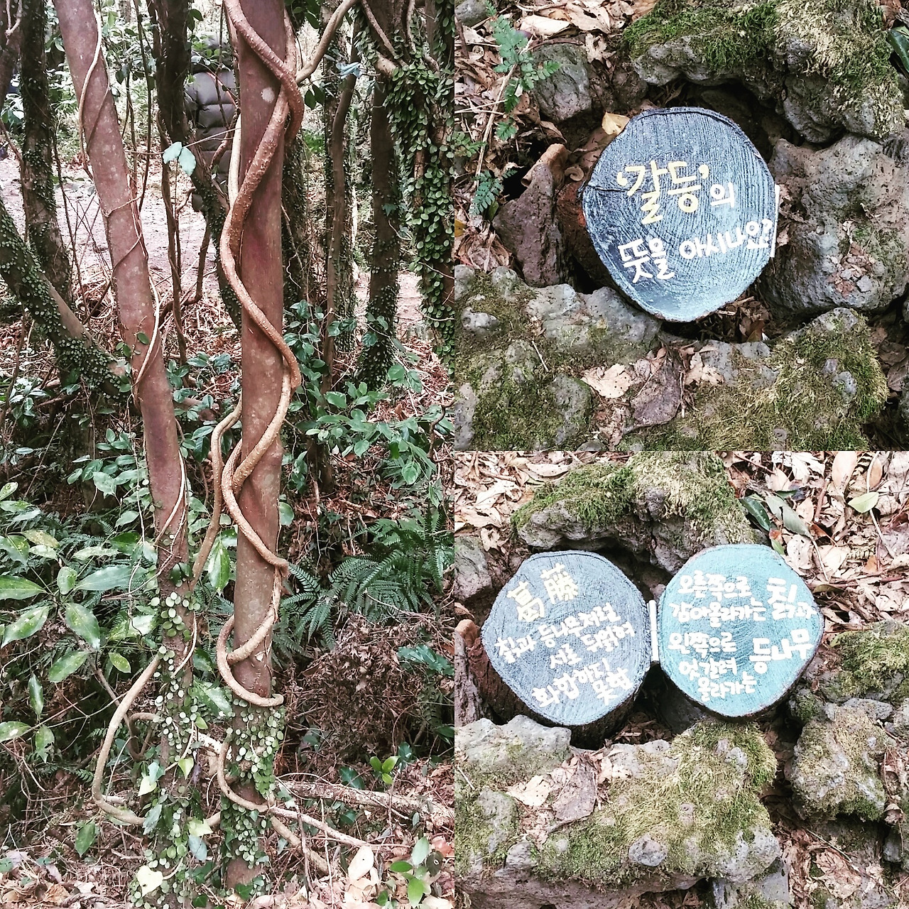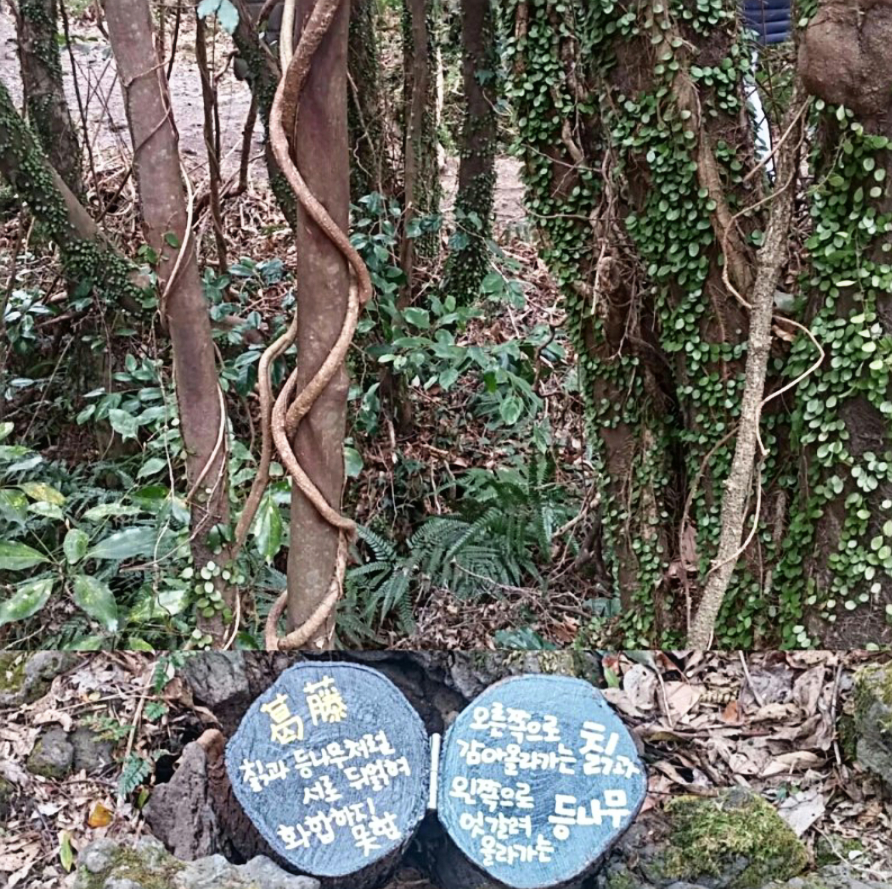 환상숲곶자왈 공원은 매일 오전 10시부터 한 시간 간격으로 숲 해설가의 풍부하고 친절한 해설이 있는데요, 50분간 치유의 숲에서 산림욕을 하며 열매에 마취 성분이 있어 낚시에 사용된 커다란 때죽나무에서 얽히고 설킨 칡과 등나무를 통해 '갈등', 그 의미를 알게 됐네요.