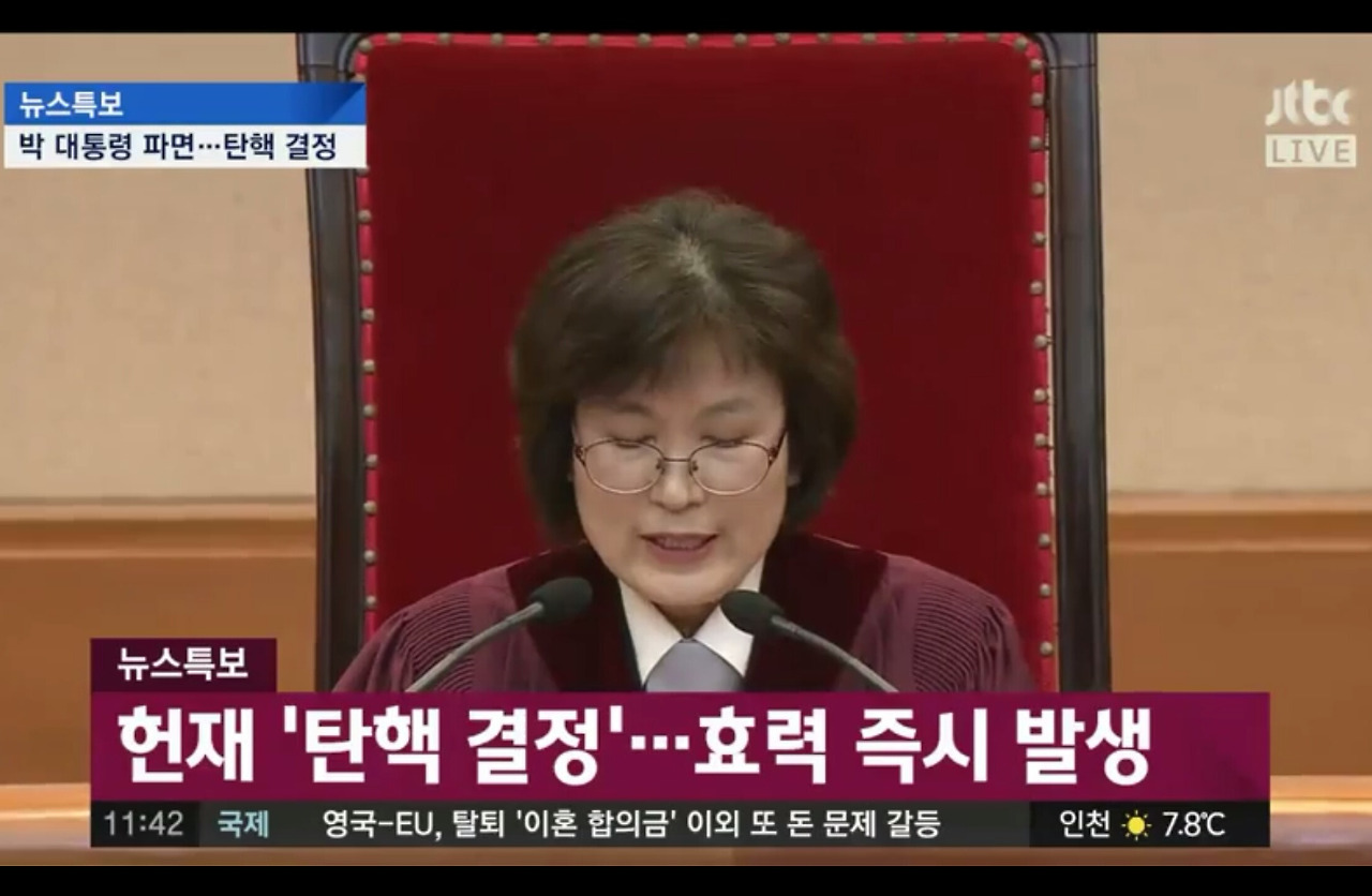 아침부터 숨죽이며 헌법재판소의 탄핵선고 공판을 지켜봤는데요, "피청구인 박근혜가 최순실 등 비선조직에 의해 국정농단을 했으며, 직무 권한을 남용해 헌법상 국민주권주의와 법치주의를 위반했다"며 대통령의 법 위반 정도가 중대한 탄핵 사유에 해당한다고 판단해 위법 행위로 판결하고 대통령 파면을 재판관 전원 만장일치로 결정했습니다.
