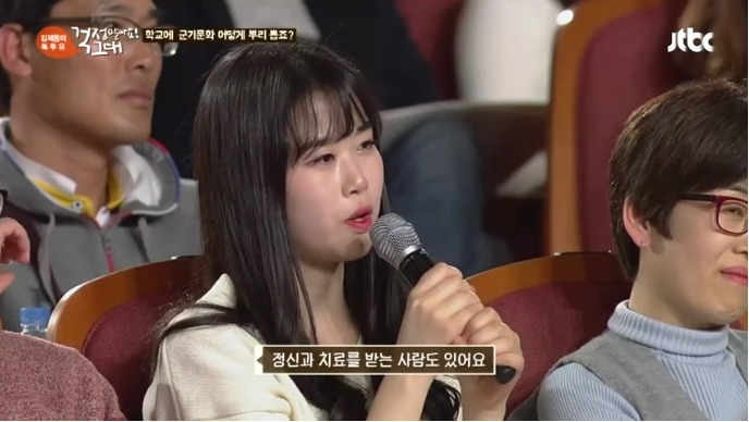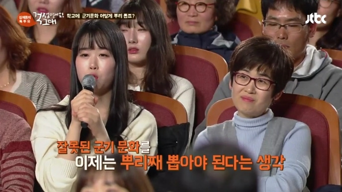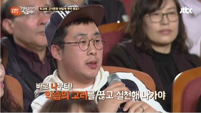 이에 또 다른 청중은 "학창 시절에도 그런 게 많았다. 내가 받았으니 나도 후배에게 해야 한다는 것이 악습이라 생각한다. 군 복무 시절에서 선임들이 얼차려를 준다고 했을 때 보일러실에 틀어놓는 노래가 브아걸의 아브라카다브라였다"고 전했으며 "상병이 되자마자 악습을 다 없앴다. 후임들도 그 뒤 후임들에게 실천해서 악습이 점차 없어졌다. 악습을 없애니까 후배들도 오히려 더 잘 따랐다"며 나부터라도 악습의 고리를 끊는 실천이 가장 중요할 것이라고 강조했죠.