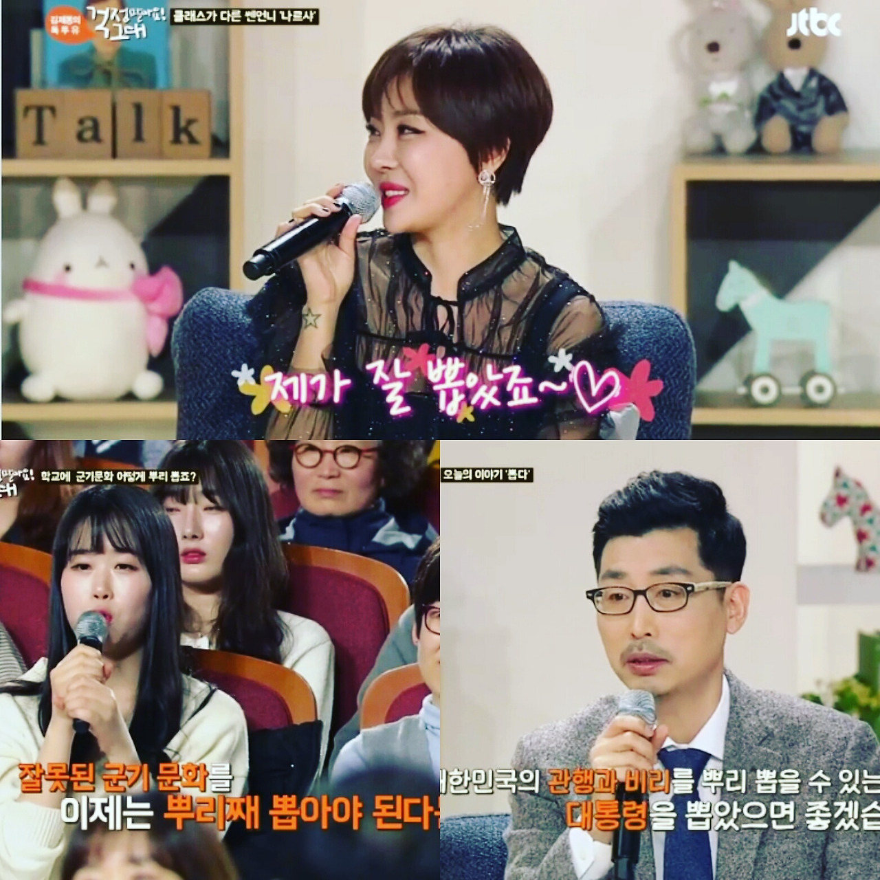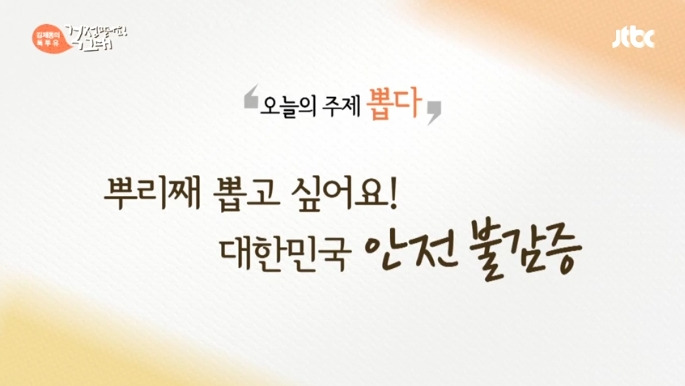 지난 9일 방송된 JTBC 힐링 토크쇼 <김제동의 톡투유-걱정 말아요 그대>(이하 톡투유)에서는 지난주 '바꾸다'에 이어 변화나 개혁이란 흐름을 표현하는 '뽑다'를 이야기 주제로 우리가 뿌리째 뽑아야 할 적폐·관행·악습을 위해 나부터 뿌리 뽑을 용기가 필요하다는 담론이 제기됐어요.