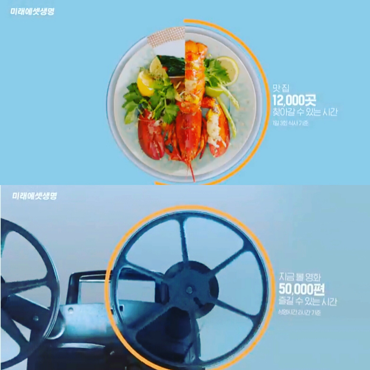 최근 영화관에서 자주 접하는 극장광고 중에 은퇴설계 캠페인을 소재로 한 금융사 광고가 눈길을 끄는데요, 60세 기준으로 은퇴 후에 부부가 함께 보낼 '10만 시간의 행복'이란 주제 아래, 걸어서 지구 10바퀴 여행하고, 맛집 12,000곳을 찾고, 영화를 5만 편 보고, 친구와 10만 번 운동하고, 사진 3억 6천만 장을 남길 수 있는 시간이라고 하죠.