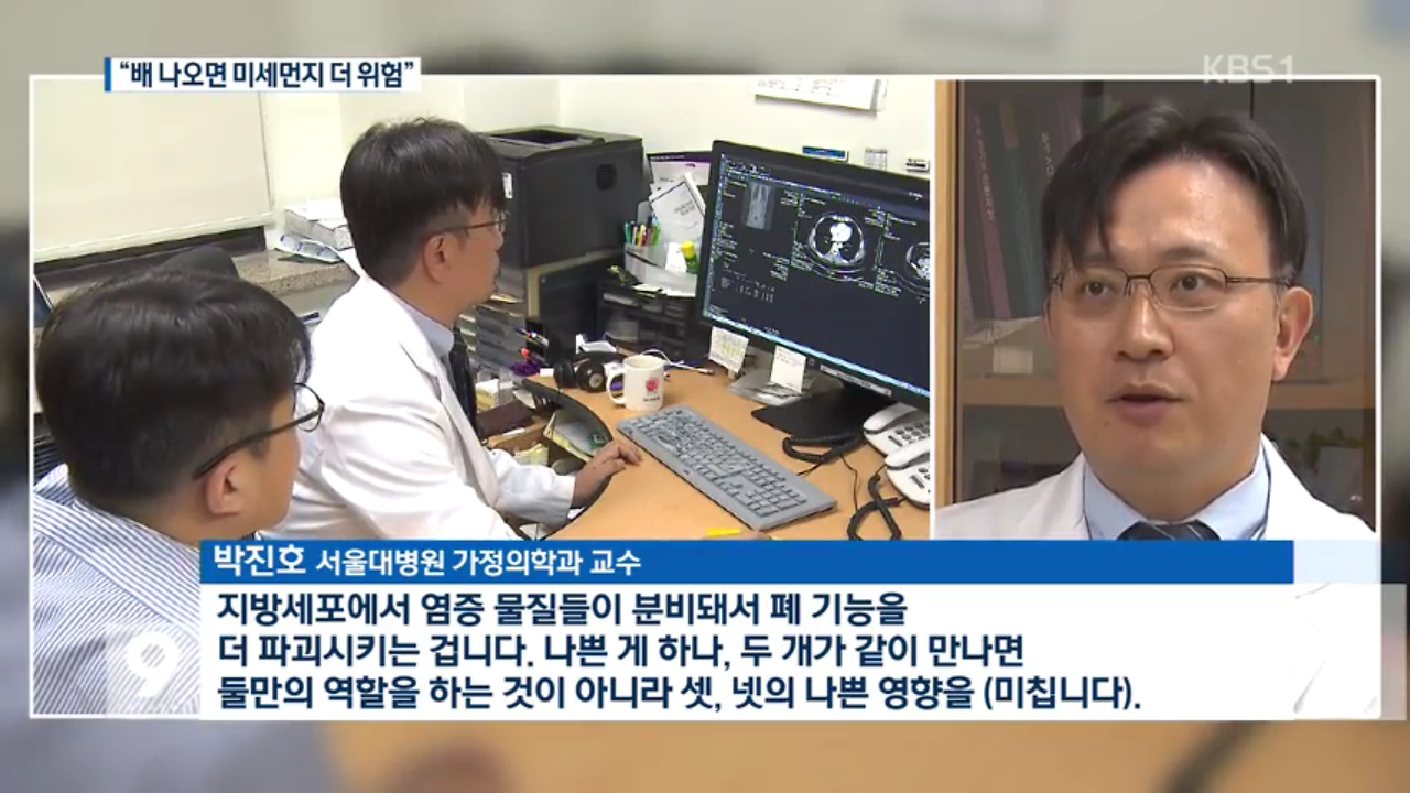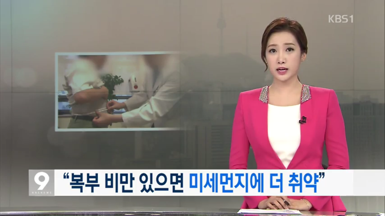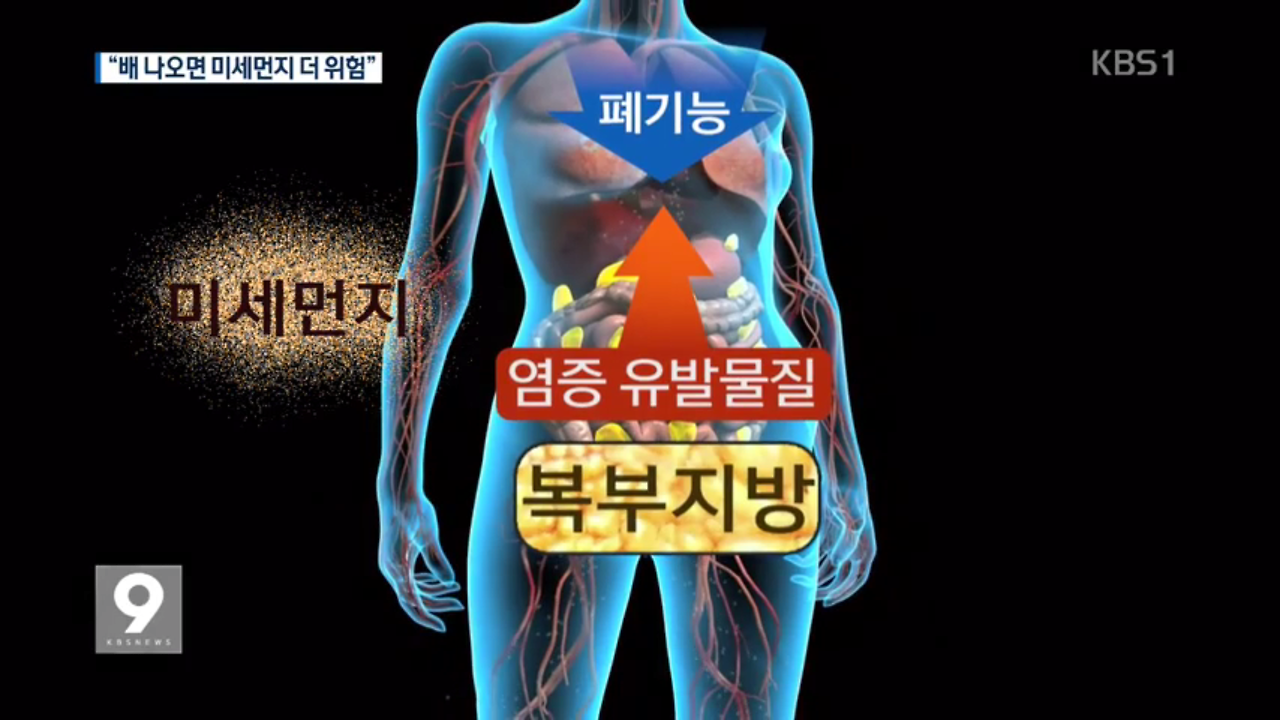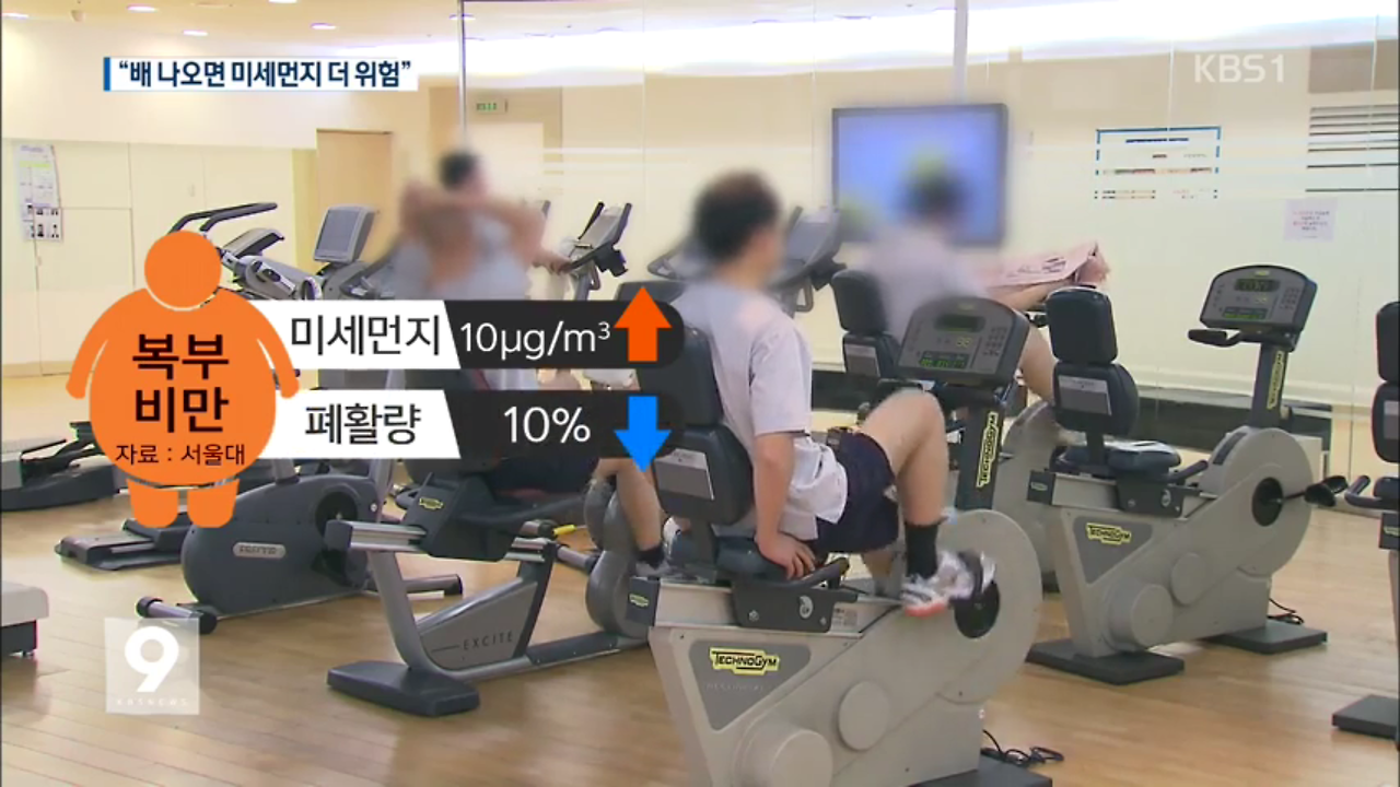 이러한 미세먼지가 인체에 해롭지만, 특히 내장 비만이나 복부 비만이 있는 사람들에게 더 위험하다는 연구결과가 나와 주목됩니다. 서울대 보건환경연구소와 조비룡, 박진호 교수 등 서울대 의대 연구팀이 2009년부터 2014년까지 서울대병원 건강검진센터를 찾은 40세 이상 남성 1,876명의 건강 상태를 분석한 결과, 평균 허리둘레 38인치 이상 복부 비만이 있는 사람들은 미세먼지가 10㎍ 증가할 때마다 폐활량 지수가 10%씩 떨어졌습니다.