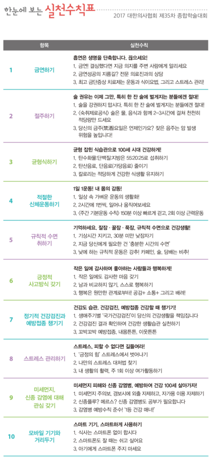 의료 전문가들의 지혜가 모인 '건강 십계명'에는 긍정적으로 생각하고 감사한 마음을 표현하며 원만한 인간관계를 만들라는 마음 건강에 관한 내용을 비롯해 금연, 절주, 운동, 숙면과 늦여름 장마의 막바지에 다시 불거지는 '미세먼지' 그리고 일상화된 '스마트기기 부작용'에 대한 권고사항이 담겨 있어요.