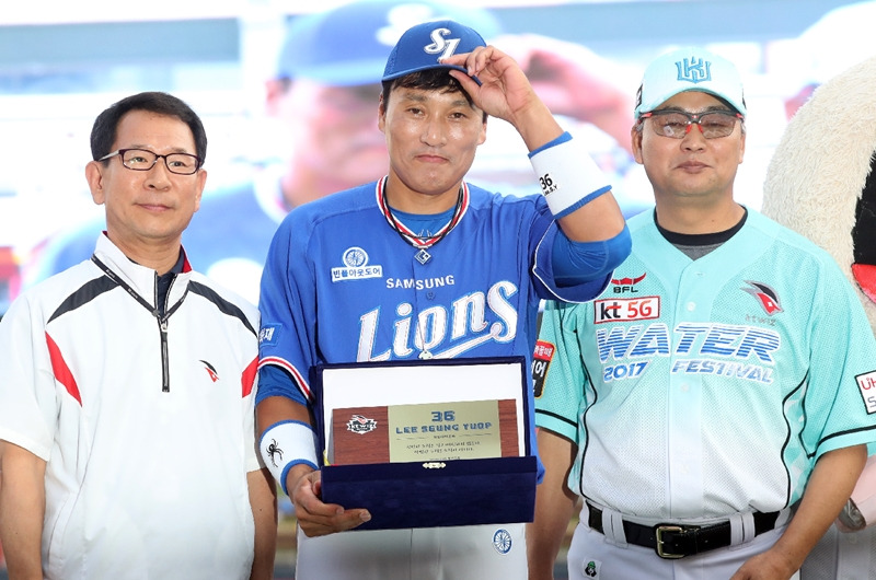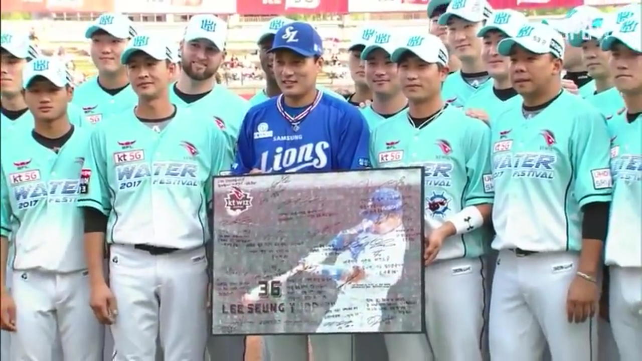 두 번째는 18일 수원 KT전이었는데요, 이날은 이승엽의 생일이기도 해서 KT위즈파크 성적도 현판에 새겼고 주장 박경수가 사진 508장을 모자이크로 만든 기념사진 액자를 선물했죠.
