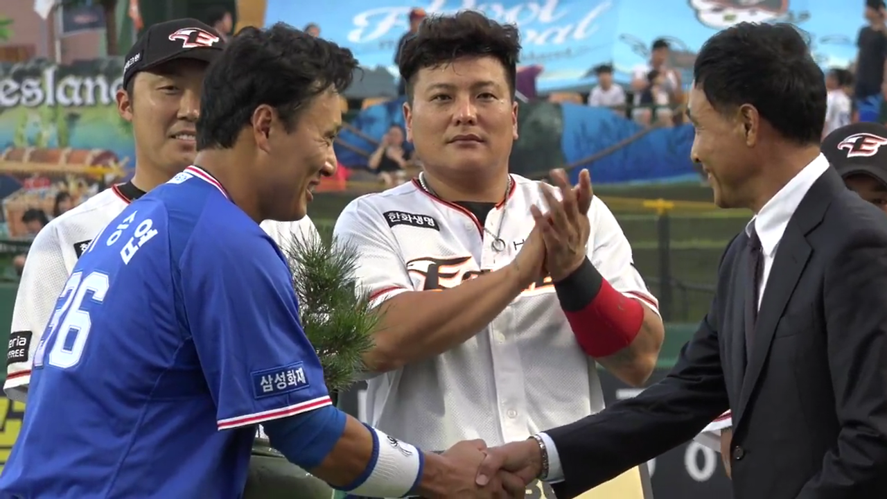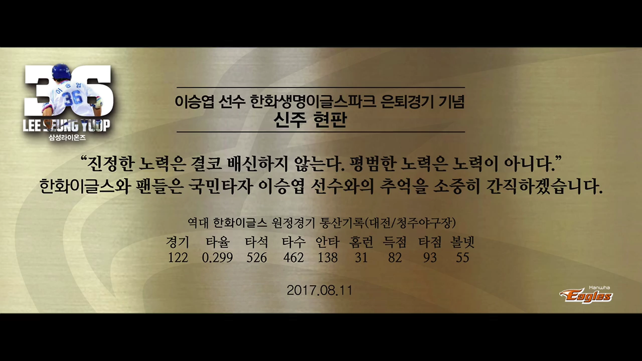 대전 한화이글스파크에서 이승엽은 경기 전 어린이 팬에게 사인회를 진행하고 대전과 청주구장에서 자신이 달성한 기록이 새겨진 현판을 선물로 받았어요.