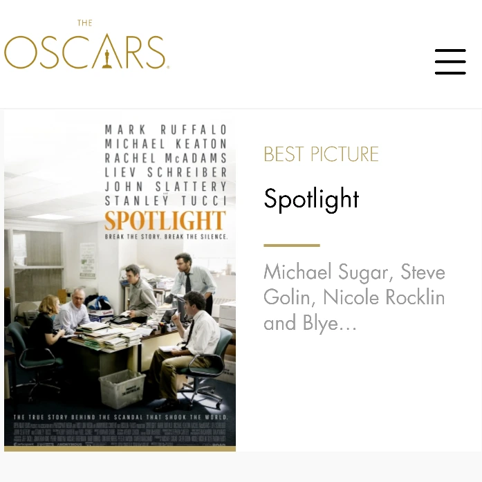 29일 오전 10시(한국시간), 미국 LA 돌비 극장에서 개최된 제88회 미국아카데미 시상식(이하 오스카)에서 미국 LA비평가협회 작품상, 배우조합상 캐스팅상을 수상하며 유력시 됐던 영화 <스포트라이트>는 최우수 작품상과 함께 각본상(토마스 맥카시,조쉬 싱어), 2개 부문을 수상했다.
