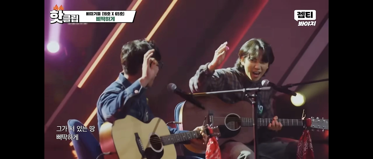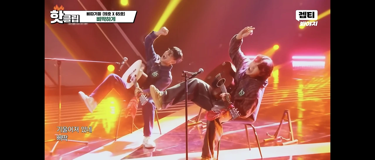 특히 2라운드 듀엣 경연에서 65호 가수는 1996년생 동갑내기인 19호 가수와 강산에의 원곡 <삐딱하게>를 들고 나와 더블 기타로 삐딱한 자세의 엔등까지 완벽한 무대로 브로맨스 케미를 자랑했다.