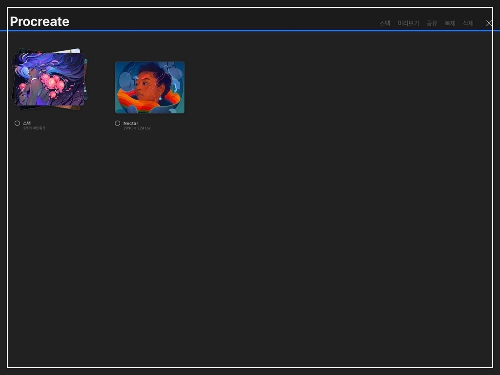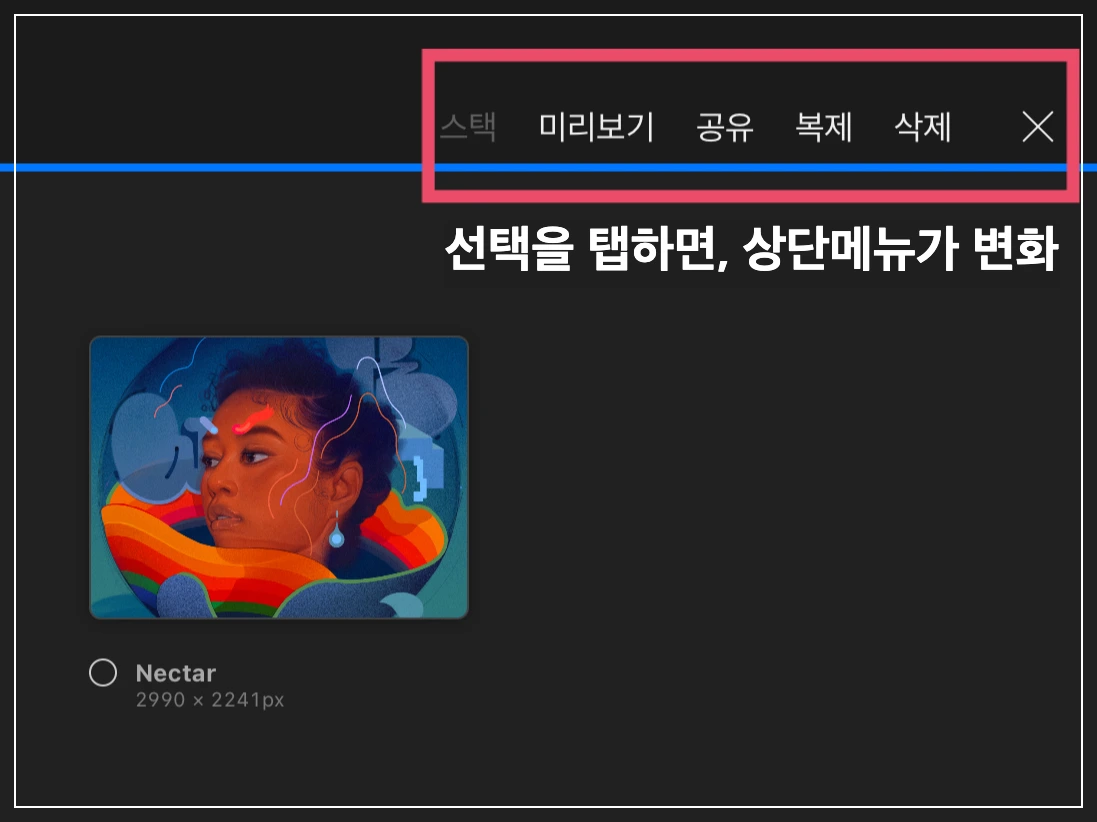 X 버튼을 눌러 선택 상태를 해제한 후, 여러 캔버스들이 겹쳐있는 모양을 탭 하면, 해당 스택을 열 수 있습니다. 해당 스택에서 다시 전체 갤러리로 돌아가려면, 좌측 상단의 <스택을 탭 합니다.
