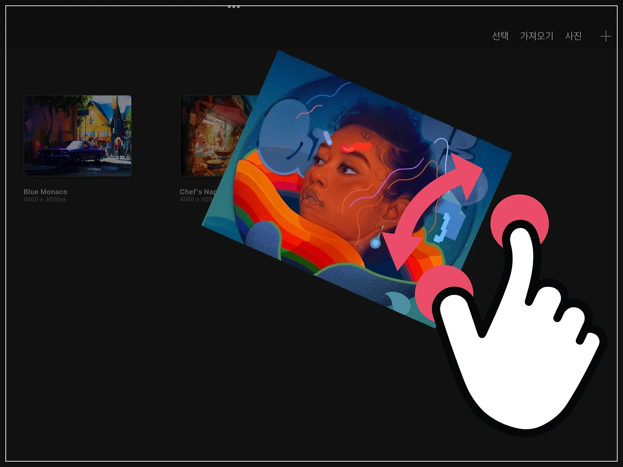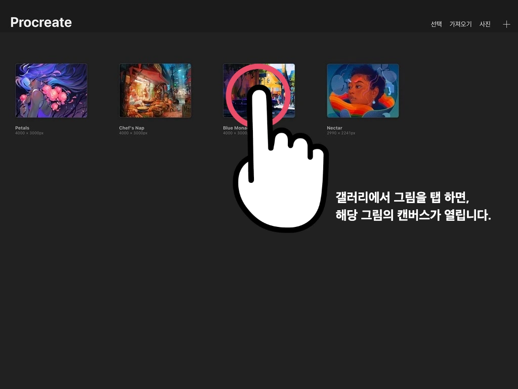 아직 우린 그림을 그리지 않았으니까, 예시 이미지를 통해 먼저 알아볼게요. 손가락이나 펜슬로 탭 하면, 해당 이미지가 확대되면서 화면 가득히 캔버스가 열리게 됩니다.
