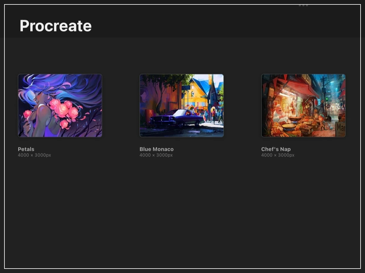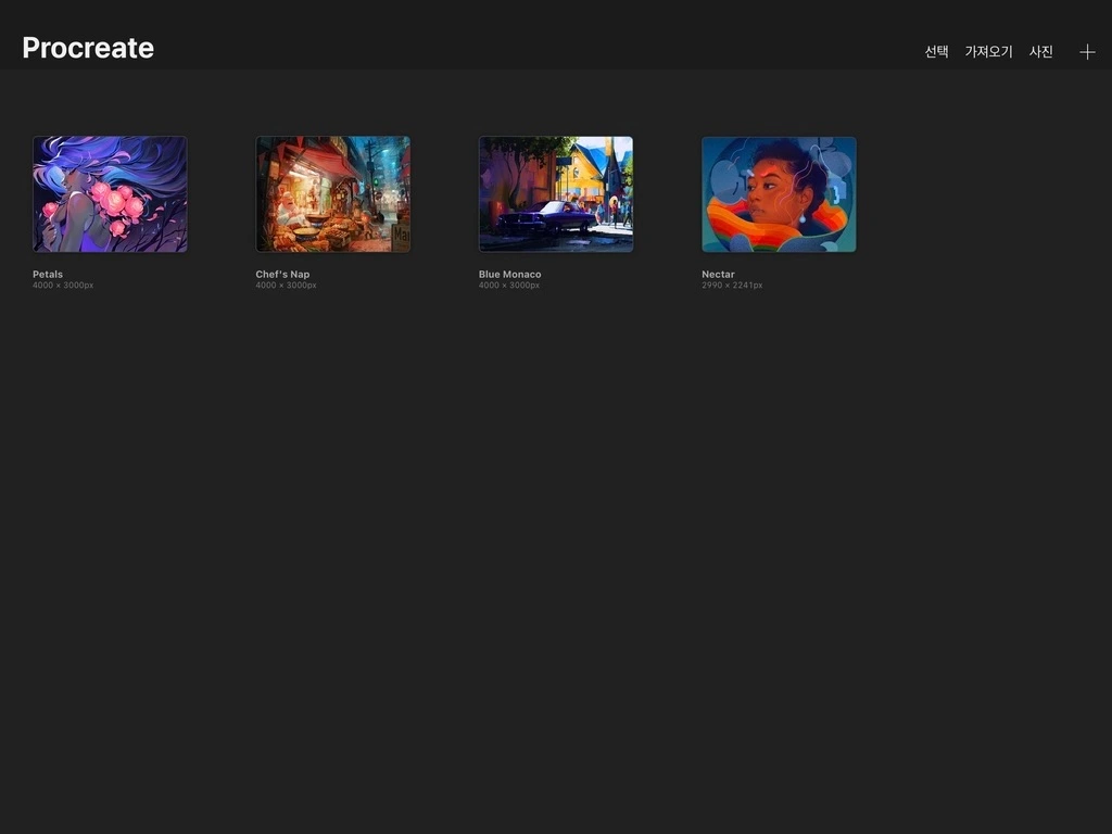 프로크리에이트를 처음 실행하면 보이는 이 화면은, 앞으로 작가님들이 그려나갈 그림들이 차곡차곡 쌓여갈 갤러리라고 합니다. 프로크리에이트에서 제공하는 기본 이미지들이 갤러리에 보이네요.