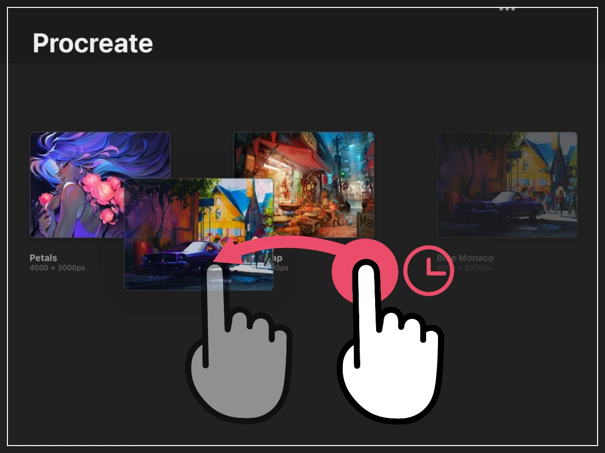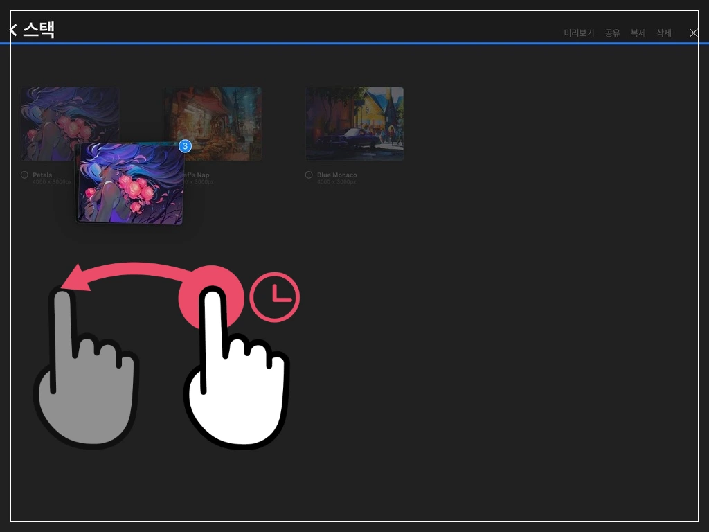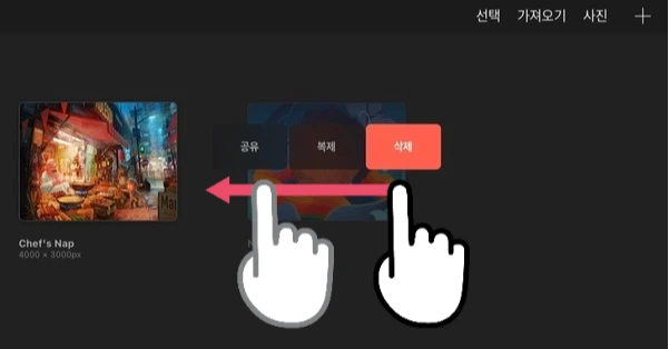 별도의 선택 없이 원하는 캔버스 이미지 위에 한 손가락을 두고, 오른쪽에서 왼쪽으로 스와이프 하면, 해당 캔버스의 공유, 복제, 삭제 옵션이 바로 등장합니다.